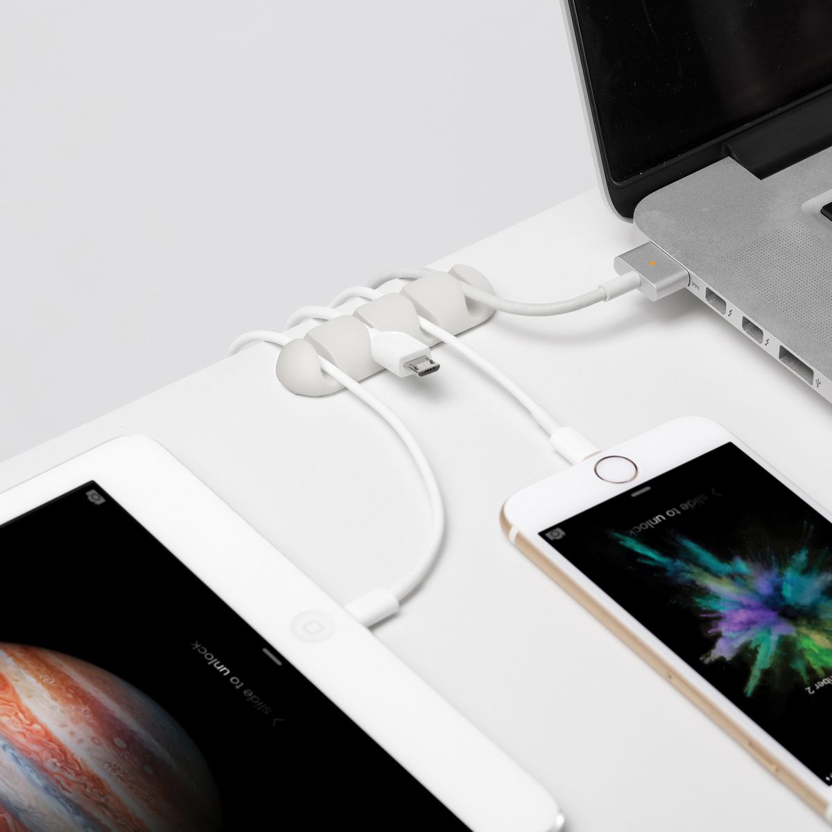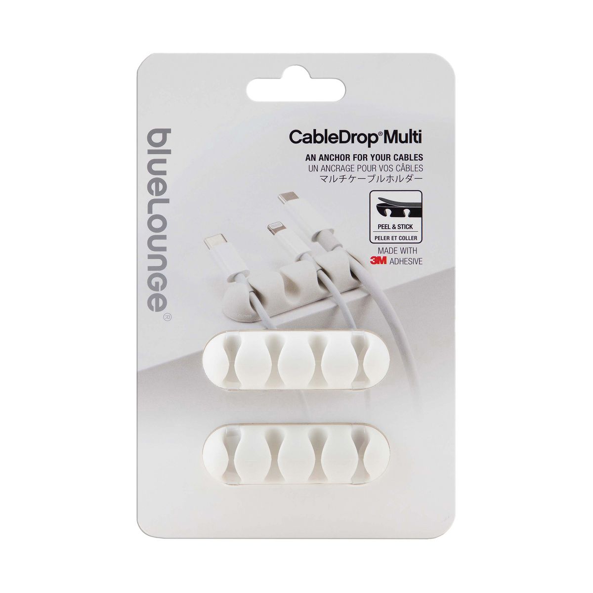 CableDrop® Multi is the ultimate cable command center that keeps up to 4 cables anchored in place so they don’t slip out of reach. Simply peel and stick the CableDrop® Multi to your desk, nightstand, or any flat surface and run the cable through the grooves to prevent from slipping. CableDrop® Multi keeps your necessary cables neatly stowed, organized, and at your fingertips. It’s ideal for cables with a diameter up to 0.3149 in. to 0.3937 in. (8 mm to 10 mm) such as Thunderbolt™ and Apple® 30-pin connectors. This pack contains 2 CableDrop® Multis.