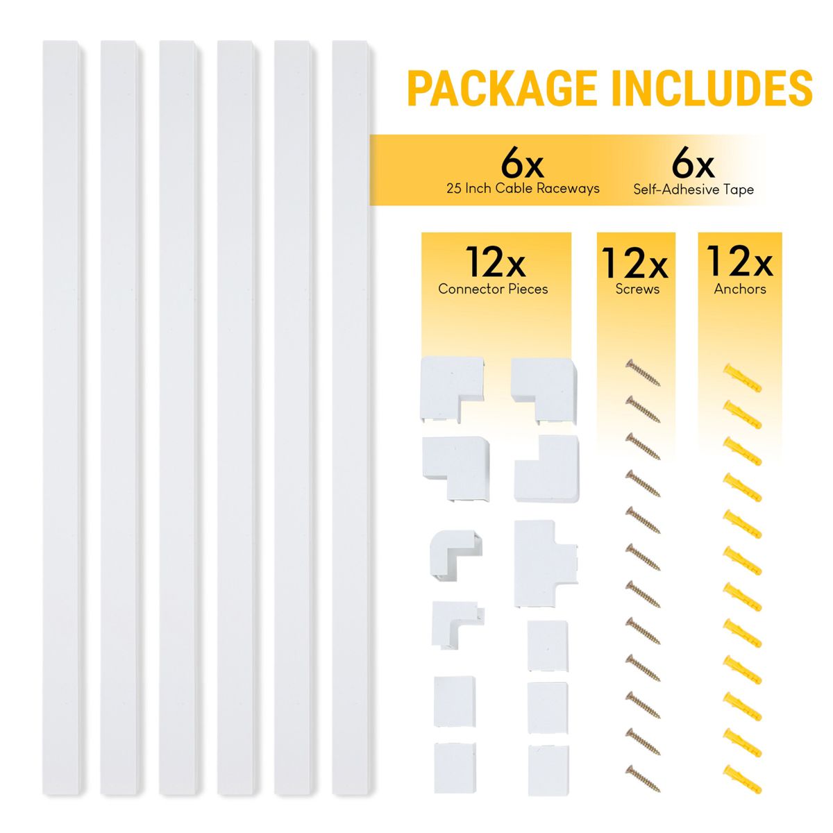 The Cable Management Kit by Fleming Supply is a smart and effective wire management option to keep electrical cables neatly and safely concealed. With six 25-inch wire organizers for cords, 6 strips of self-adhesive tape, 12 connectors (5 straight, 4 elbow, 1 inside elbow, 1 outside elbow, and 1 T), 12 screws, and 12 wall anchors all included in the 48-piece set, you’ll have everything you need for effective cord management. Use this cord hider wall set to conceal the cables of your mounted TV, keep wires away from children and pets, and discreetly run cords along your baseboards.