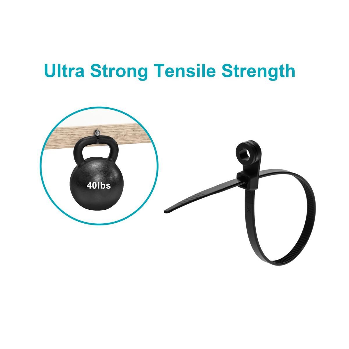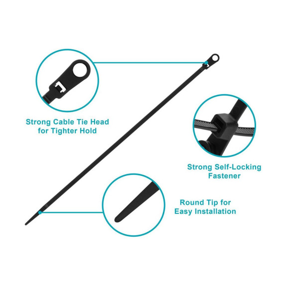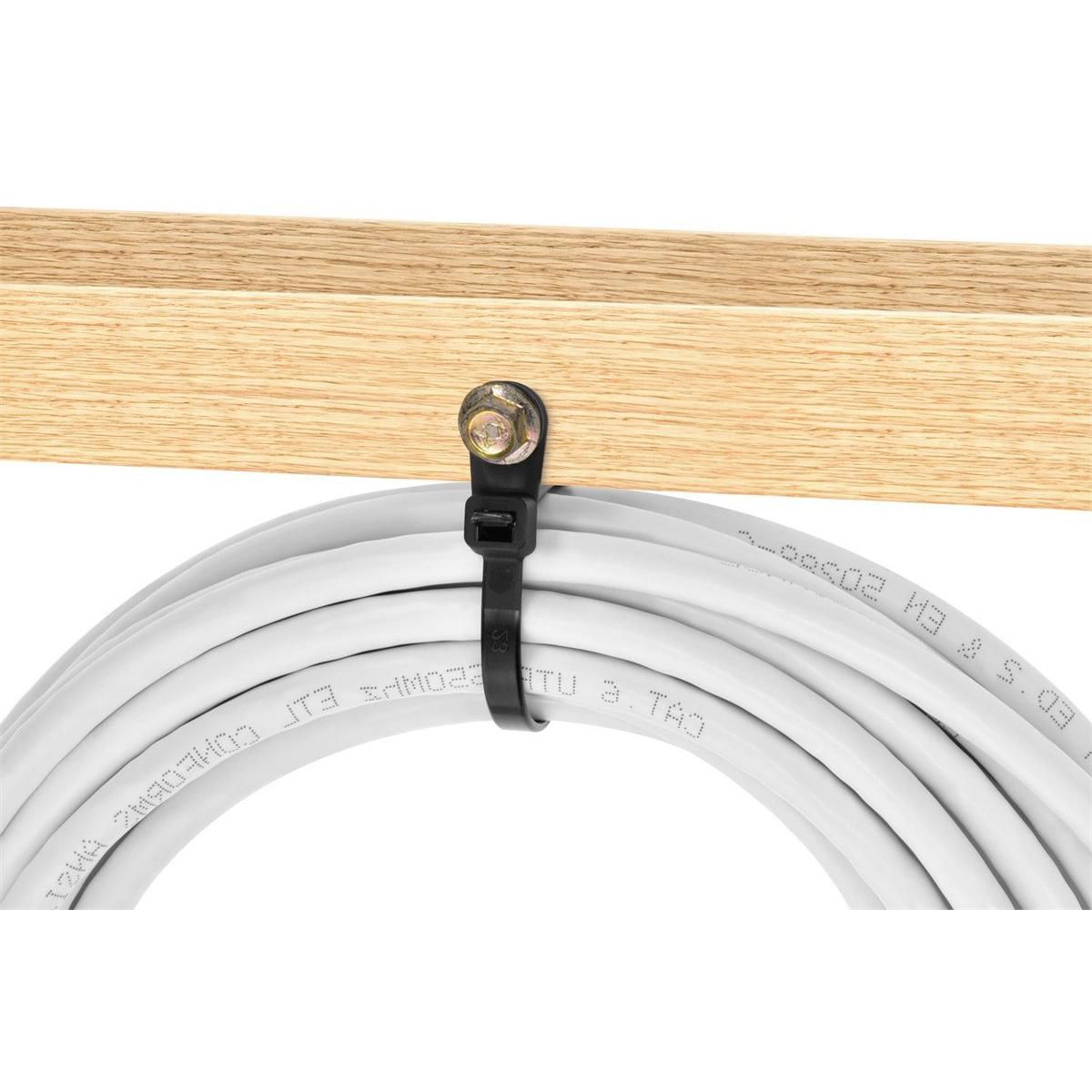 Mountable head cable ties combine two great products into one. Zip bundles of cables together and mount the ties to a wall using the integrated mounting eyelet on the zip tie head. No need for additional wall clips or mounts. Helps keep cables neat and organized. Prevents loose cables from wandering and causing accidents. Prolongs cable life by keeping them out of the path of traffic.