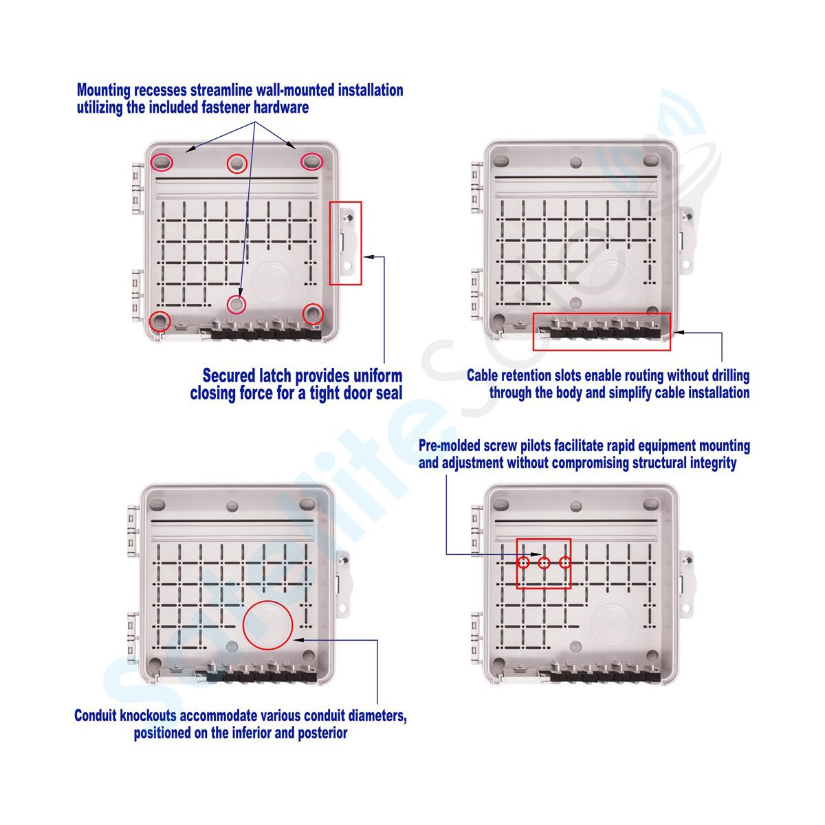 SatelliteSale Weatherproof Junction Box Heavy Duty sockitbox are widely used by cable technicians to manage cables and wires. It is made of a high-quality UV-rated thermoplastic alloy, which can be painted to match your design. A special rubber gasket at the bottom ensures snug cables connection and makes the outdoor watertight electrical box weatherproof. A rugged PVC Demarcation waterproof boxes for electronics combines a simple, minimalistic design and safety of the wires or electronics enclosure inside, extending their lifespan. SatelliteSale Weatherproof Junction Box Heavy Duty electrical enclosures comes with cable retention slots that simplify waterproof enclosure installations and allow work to be completed outside of the box. The electrical boxes, conduits & fittings openings provide an easy installation for your devices. Use it to install large and small gauge wires, cables, invisible electric fence control systems, wireless extenders, sprinkler control systems, wireless access points, water pool control systems, and even a DIY case for the Raspberry Pi Computer. It can also be used as an irrigation controller cabinet, sprinkler and timer controller, or wiring cabinet. Run electrical wiring through the specially designed conduit on the side or the bottom of our vented outdoor enclosure box. Designed to be handy to any technician, the SatelliteSale junction box reduces setup time and has uniquely designed features to keep every enclosure installation neat and clean. It is perfectly suitable for both residential and commercial projects, as it comes in four convenient sizes. Every plastic electrical enclosure comes with screws for your convenience. This electronics enclosure was designed not to impede the wireless signal. We assure the lifetime service of each SatelliteSale Multi-Purpose Weatherproof Heavy Duty waterproof project box cable to maintain the satisfaction of our clients.