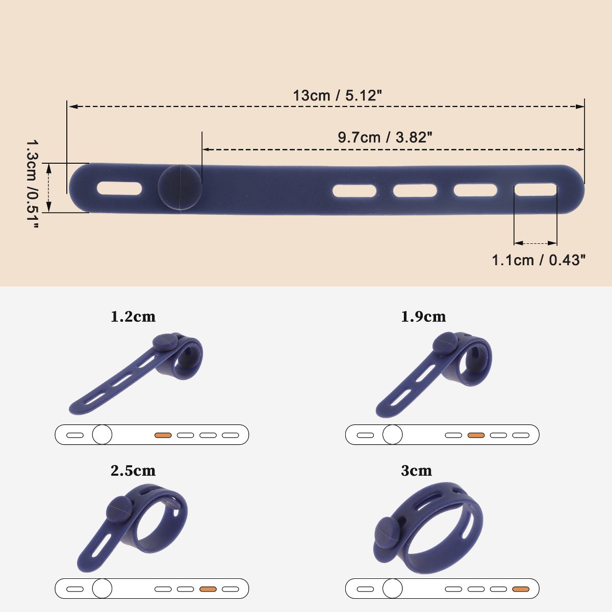 Specifications: Material: Silicone; Hole Length: 1.1cm / 0.43"; Buckle to End Length: 9.7cm / 3.82"; Bundling Hole Diameter: 1.2cm / 0.47", 1.9cm / 0.75", 2.5cm / 0.98" , 3cm / 1.18"; Size: 13x1.3cm / 5.12"x0.51"(L*W).