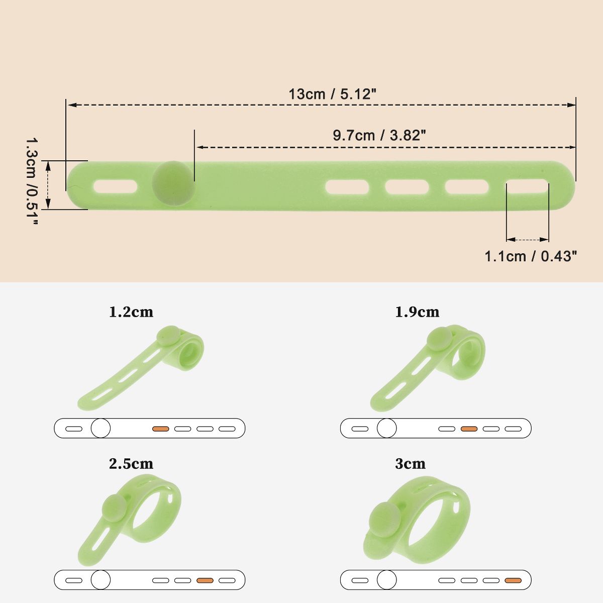 Specifications: Material: Silicone; Hole Length: 1.1cm / 0.43"; Buckle to End Length: 9.7cm / 3.82"; Bundling Hole Diameter: 1.2cm / 0.47", 1.9cm / 0.75", 2.5cm / 0.98" , 3cm / 1.18"; Size: 13x1.3cm / 5.12"x0.51"(L*W).