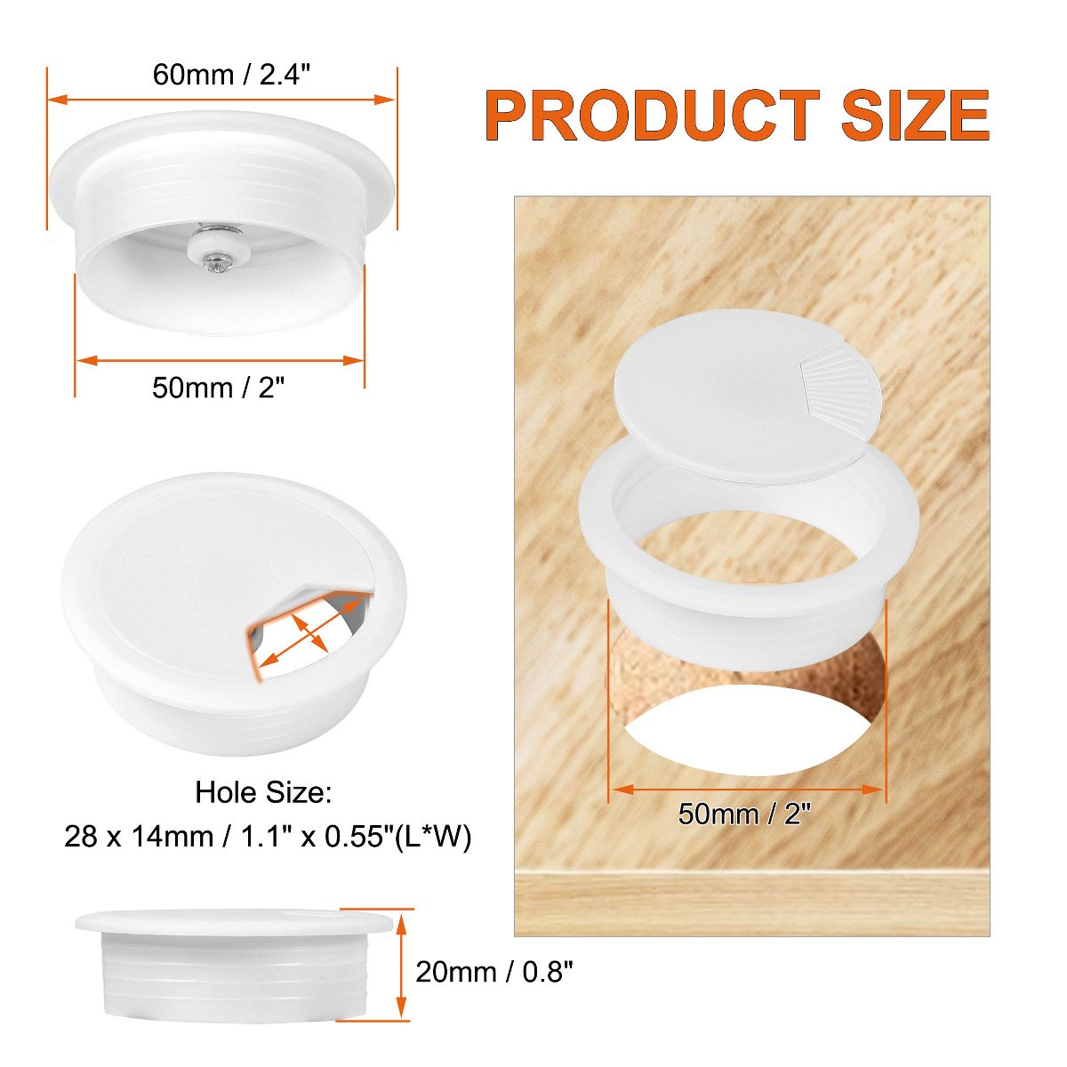 The package includes 4 packs of desk cable grommets designed to provide a tidy solution for managing wires and cords on computer tables and countertops. Each desk grommet has a diameter of 2 inches, making it suitable for routing cables through the holes in desks or other surfaces. The grommets are made of plastic material and are suitable for various sizes of computer cables. They are an ideal accessory for installing cables on computer desks and are widely used in offices, homes, hotels, banks, and other settings. By using desk grommets, you can hide unsightly cables and create a clean and professional-looking workspace.