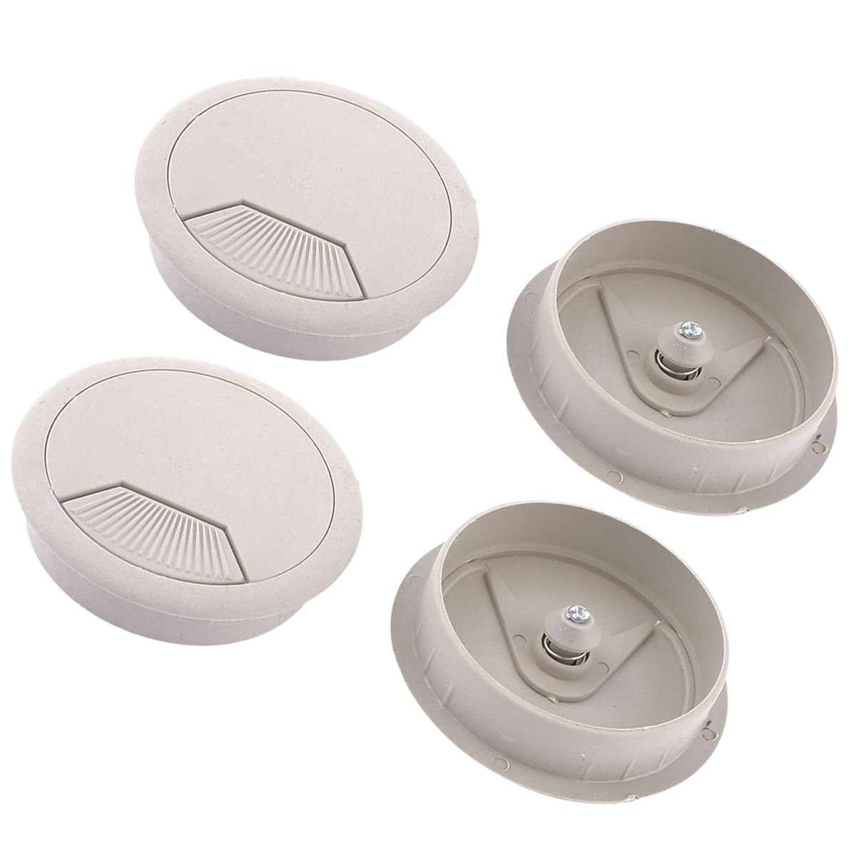 The set includes 4 pieces desk wire grommet, designed for managing wires and cables in your home or office. Made of plastic material with a polished finish, they prevent scratches and scuffs on your cables. The gray grommet cable hole cover allows wires to pass through safely and neatly. Suitable for computer desks, conference tables, and various desktops, providing a tidy environment. The detachable lid offers flexibility in organizing wires. Easy to install by inserting into pre-drilled holes, fitting a 60mm diameter.