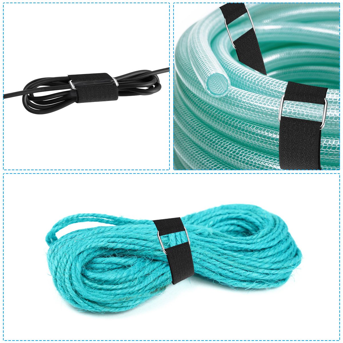 These hook and loop straps provide a secure and adjustable solution for organizing cables. Made from durable nylon fabric, they feature hook & loop attachments that adhere firmly to the nylon surface, ensuring a strong hold that won't come off over time. Ideal for bundling wires, cables, hoses, and other items, these straps are versatile and can also be used as DIY sewing adhesive fasteners. With 25 metal buckles included, you can cut any length from the cable tie roll to suit your needs. Simply pull the end through the metal loop eye, tighten it, and fold it back. For optimal bundling, overlap at least 4 centimeters.