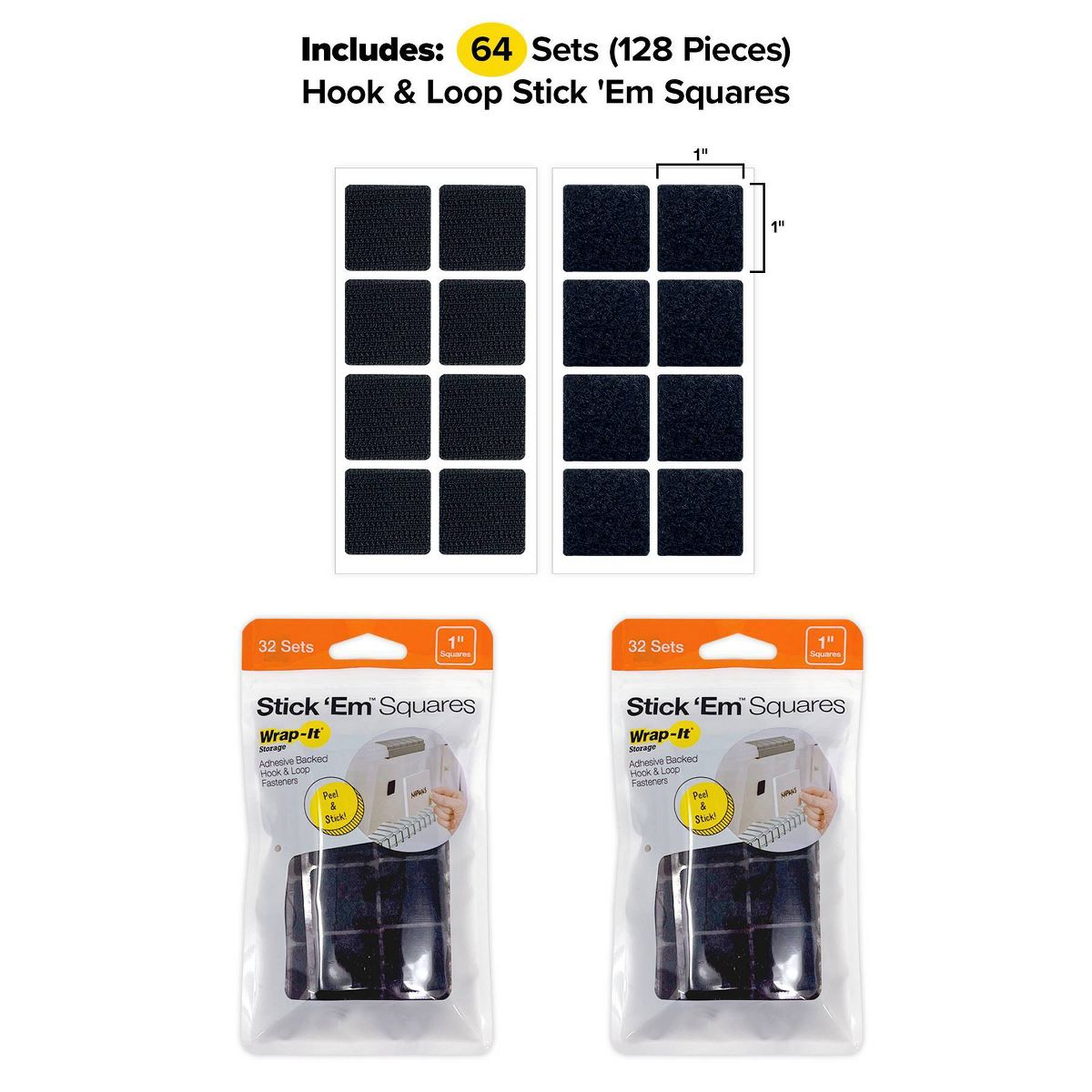 Wrap-It 64 Sets Square Stick 'Em Adhesive Back Hook and Loop: Cable Management Cord Organizer Clips, Black