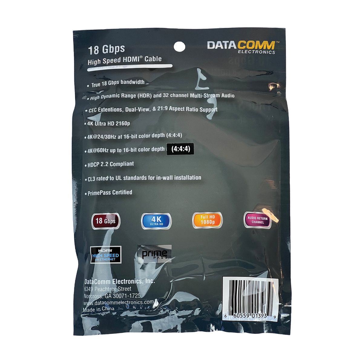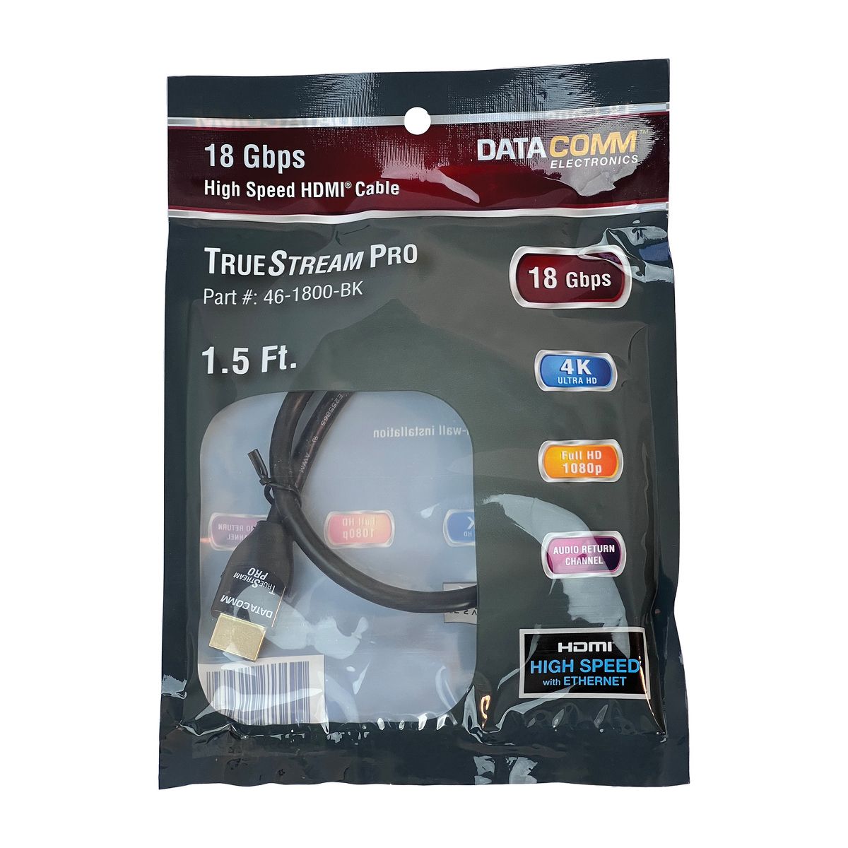 Connect your home theater equipment with confidence using DataComm Electronics 18-Gbps High Speed HDMI® Cables with Ethernet. This 18-Gbps cable offers you consistent reliability and true high speed 18 Gbps data transmission rates, ensuring signal integrity at any length. This high-performance cable is CL3 rated to UL® standards for use in walls. Plus, it supports transmissions of 4K Ultra HD 2160p resolution. _