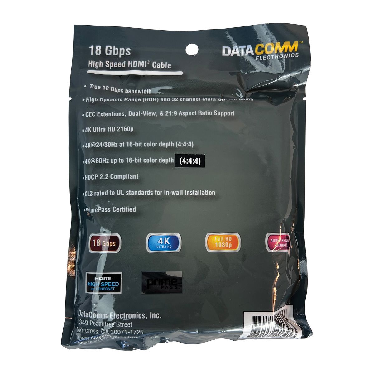 Connect your home theater equipment with confidence using DataComm Electronics 18-Gbps High Speed HDMI® Cables with Ethernet. This 18-Gbps cable offers you consistent reliability and true high speed 18 Gbps data transmission rates, ensuring signal integrity at any length. This high-performance cable is CL3 rated to UL® standards for use in walls. Plus, it supports transmissions of 4K Ultra HD 2160p resolution. _