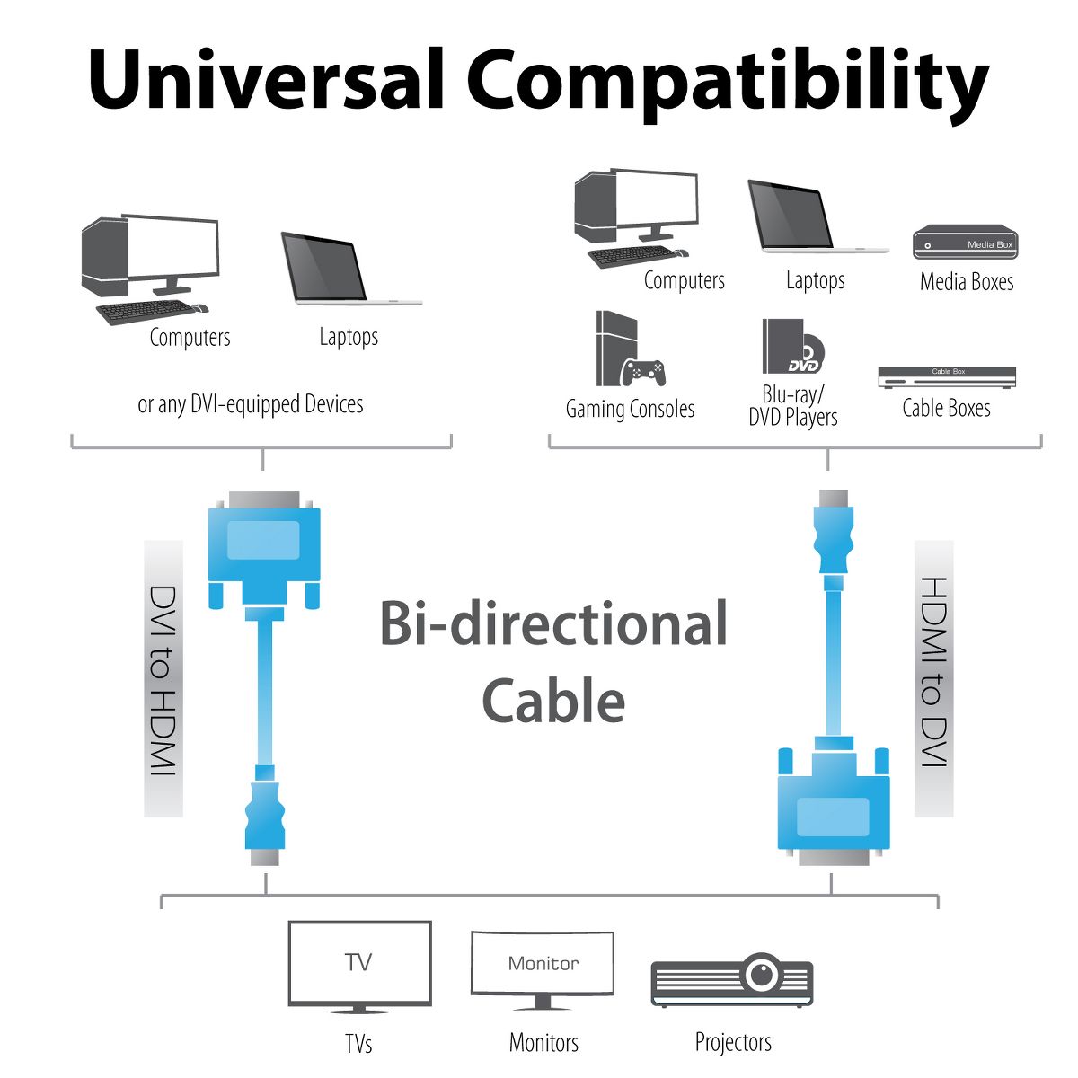 - Connect your HDMI enabled devices such as computer, Blu-Ray, PlayStation 3, Xbox 360, Xbox One X, Xbox One S, Xbox One to a DVI equipped monitor or TV