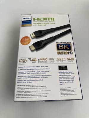 Engage in the ultimate gaming and viewing experience with the Philips Elite 8K Ultra High-Speed HDMI® Cable. This HDMI Cable is not limited to 4K@60HZ, it can out perform 4K and achieve 8K ultra-high image quality. With 8K's Dynamic HDR capability, this 8K cable helps deliver a bright, clear picture with richer, more vibrant colors designed for enhanced streaming, real-time gaming, 3D movies, virtual reality and more. With the ability to transfer data at 48Gbps, this 8K HDMI cable is future-ready for enhanced audio, video and gaming in 8K at 60Hz as well as resolutions up to 10K. This high-performance 8K cable features maximum shielding to minimize electromagnetic interference, as well as boost data transfer. Its 10ft. braided cable provides extra length for versatile setups and is resistant to stiffening and damage. The patent-pending EZ Grip™ connectors let you easily grasp each end to connect any two HDMI-equipped devices, and their gold-plated connectors provide crystal-clear transfer of video and audio, allowing you to enjoy rich images in 8K and 4K Ultra HD. Take your gaming and movies to the next level with the Philips Elite 8K Ultra High-Speed HDMI® Cable.