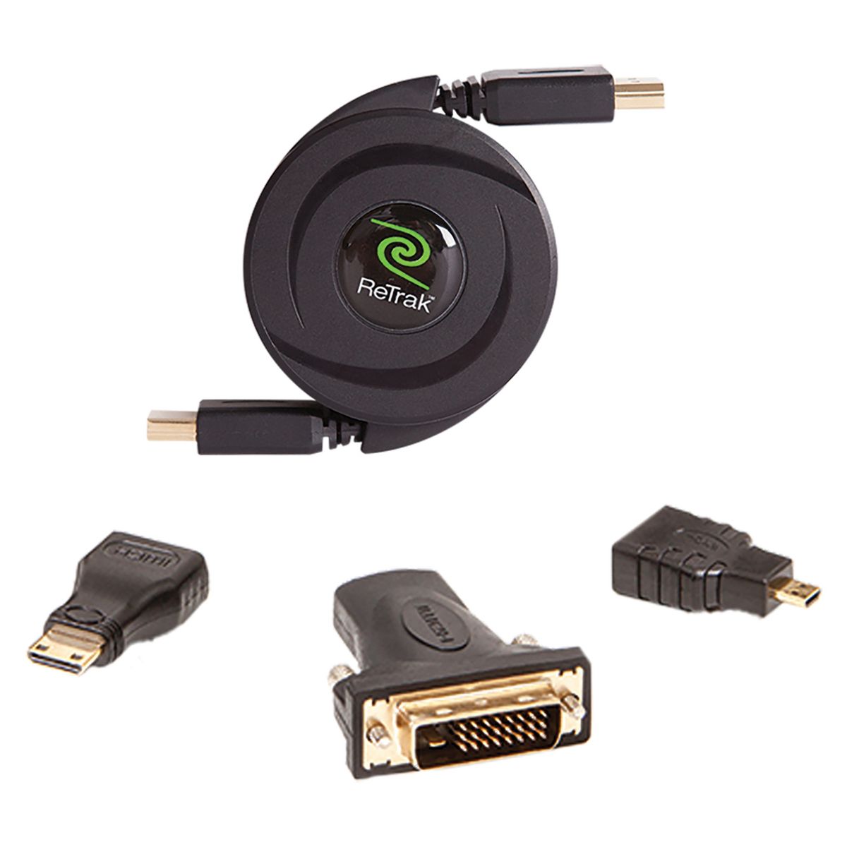 ReTrak® Retractable Standard HDMI® Cable with Mini, Micro, and DVI Adapters, 5 Ft. in Black