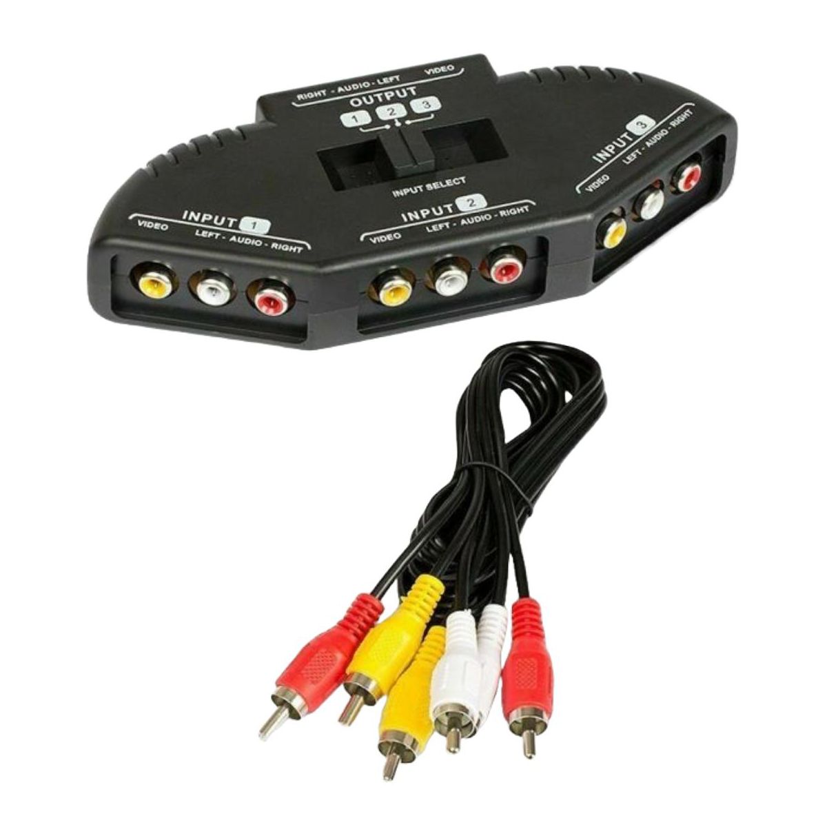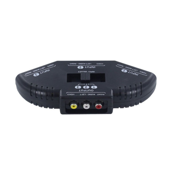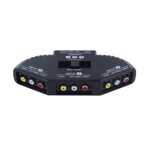 Black 3 Port AV Composite RCA Selector Box Switch Splitter w/ Cable Cord Plug. Eliminate the clutter of multiple cables and effortlessly switch between audio/video sources with the Black 3 Port AV Composite RCA Selector Box Switch Splitter. This compact and versatile selector box allows you to connect up to three devices, such as DVD players, game consoles, or VCRs, to a single TV or projector. With its easy-to-use push-button control and included RCA cables, this selector box provides a convenient solution for managing multiple audio/video sources in your home entertainment setup. Conveniently switch between three audio/video sources: Enjoy seamless switching between your connected devices without the hassle of disconnecting and reconnecting cables. Easy-to-use push-button control: Simply press the corresponding button to select the desired audio/video source.