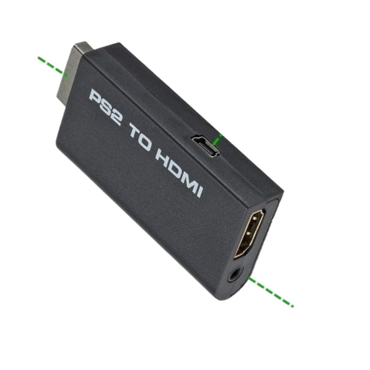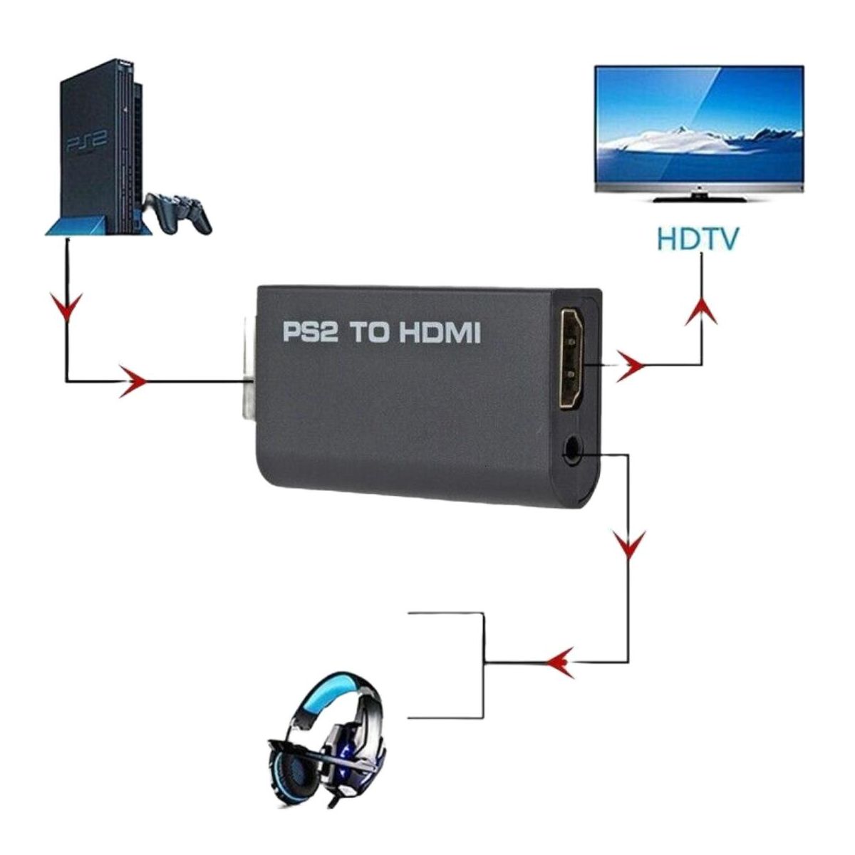 This PS2 to HDMI converter adapter allows you to connect your PS2 console to your HDTV or monitor via HDMI. It supports all PS2 display modes and outputs pure digital HDMI video/audio signals, with no transmission loss. Plug and play, no driver or power adapter required. Input Connector: PS2 AV Multi Out Plug x 1 Output Connector: HDMI Connector x 1, 3.5mm Stereo Audio Jack x 1