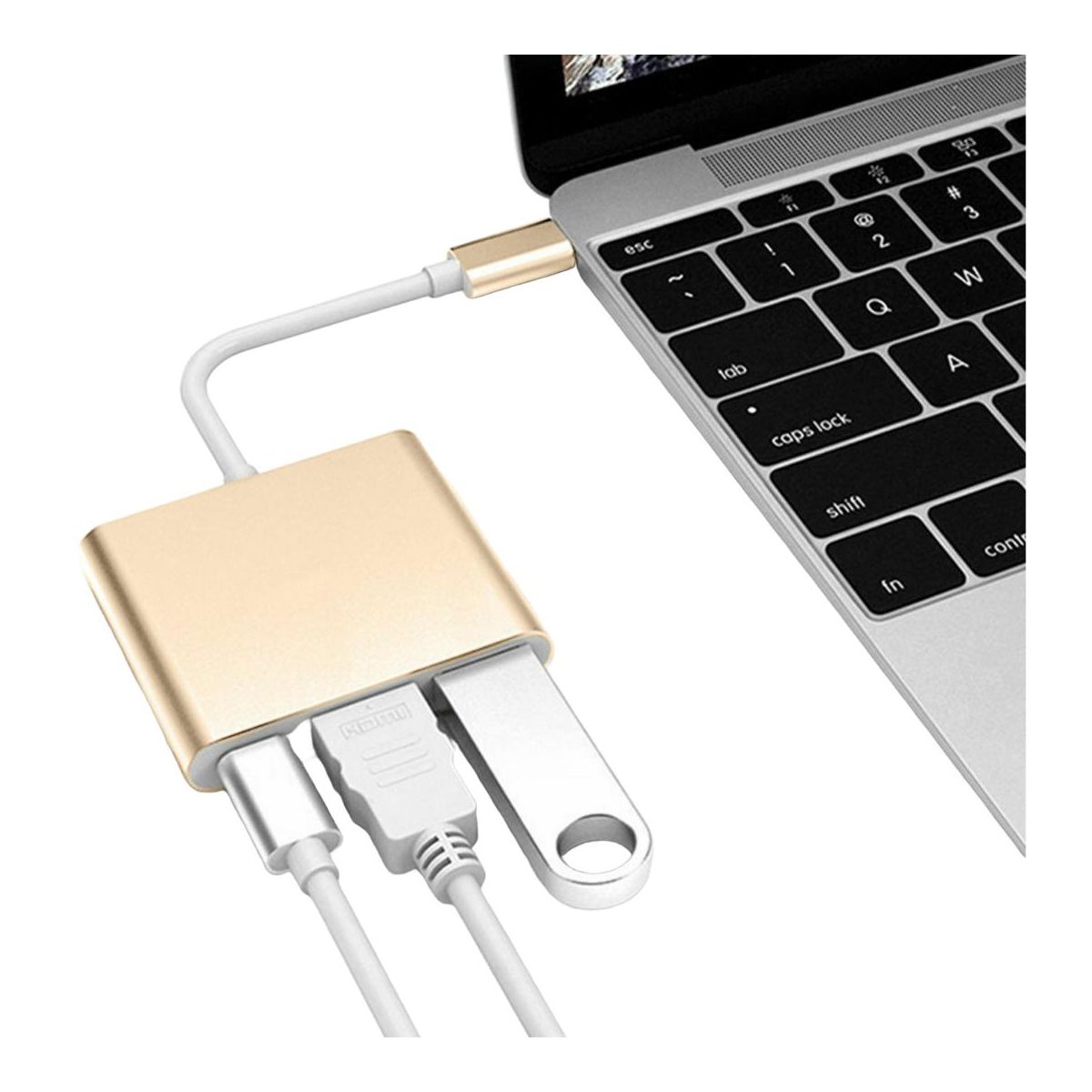This Type C USB 3.1 USB-C 4K HDMI USB 3.0 Adapter Cable 3 in 1 Hub is a multi-functional adapter that allows you to connect your MacBook to an HDMI display, standard USB device, and USB-C charging cable simultaneously. It is a perfect solution to the problem of less interface. The adapter is durable and provides maximum conductivity and improved Hi-Speed signal transmission. The HDMI port supports mirroring your laptop display to your TV or display in up to 4K at 60Hz or UHD at 30Hz, and it also outputs video content like movies and captured video. The adapter is plug and play, so no driver installation or external power is required. It can connect U disk, hard drive, mouse, keyboard, phone, and etc. Benefits: Connect your laptop to an HDMI display, standard USB device, and USB-C charging cable simultaneously. Perfect solution to the problem of less interface. Multi-functional adapter. Durable design with maximum conductivity and improved Hi-Speed signal transmission. Plug and play, no driver installation or external power required