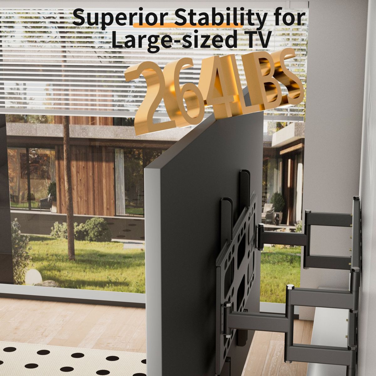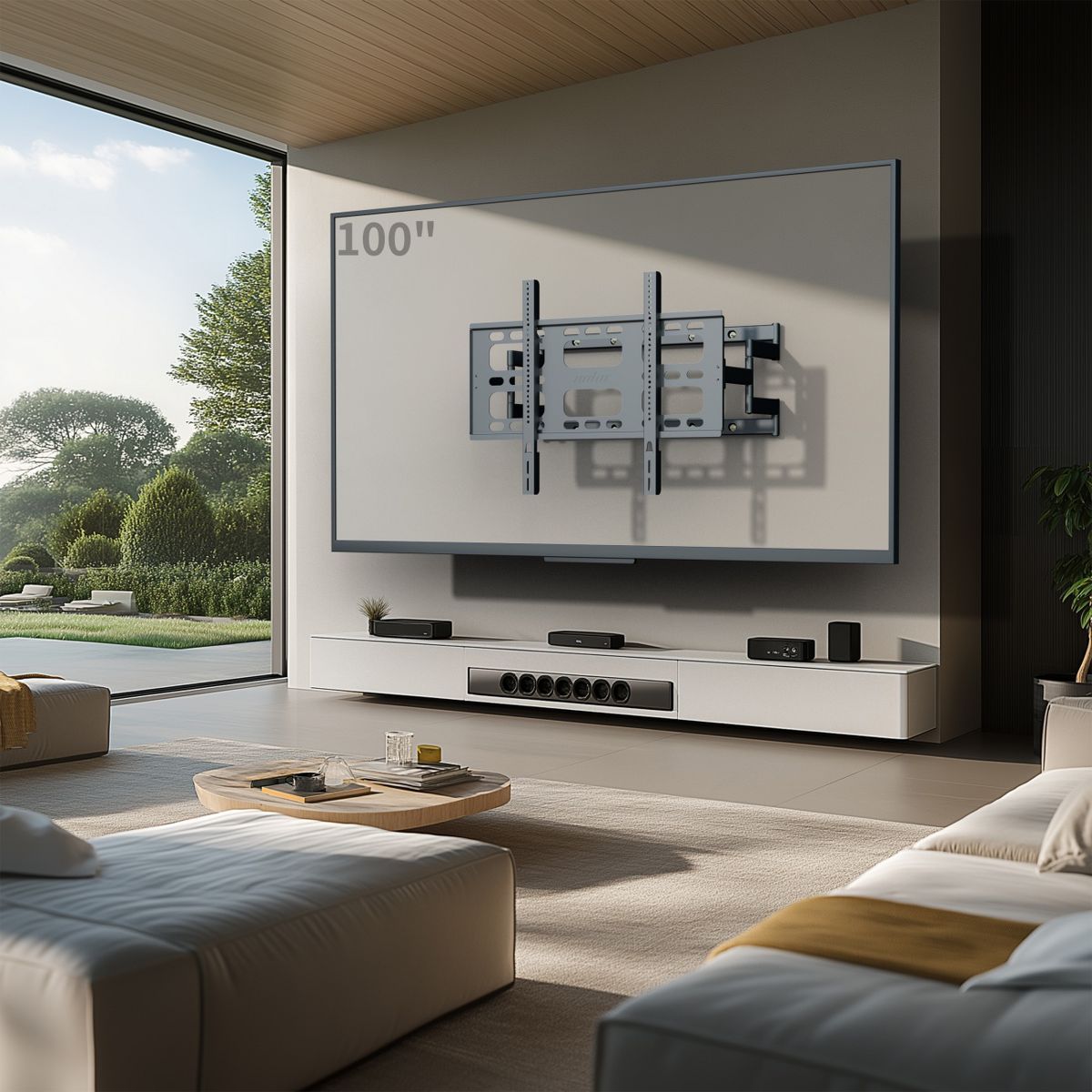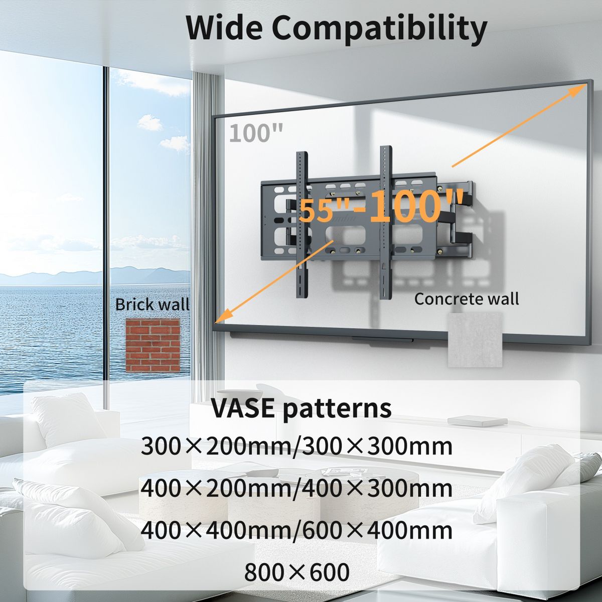 Experience ultimate viewing flexibility with our robust wall-mounted TV bracket! Suitable for 55"-100" LCD/LED screens up to 264lbs, it supports VESA patterns from 200x200mm to 800x600mm. Crafted from heavy cold rolled steel, it features a swivel mechanism and articulating arm for perfect viewing angles. Universal fit for all wall types, it saves space and enhances your viewing experience. Buy now for a sleek, professional look!