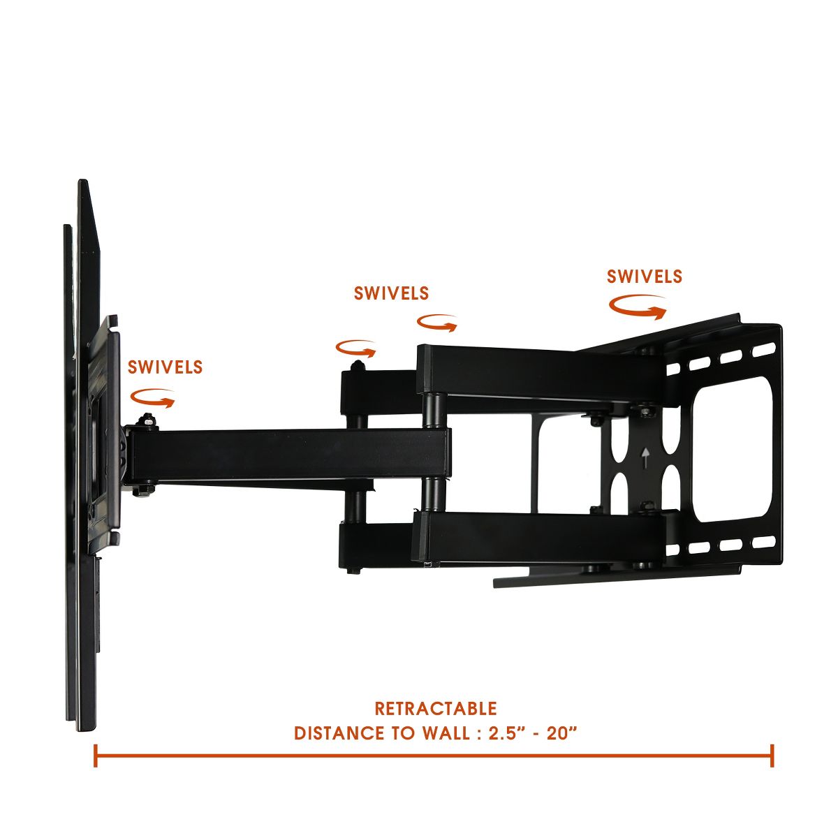 The Megamounts Full Motion Double Articulating Wall Mount is an all-right solution for those looking to enjoy TV shows comfortably no matter where they sit and how they sit. That is achieved by extending the mounted TV from 2.5" to 20" or retracting it back, swiveling up to 120 degrees, and tilting from -20 to +10 degrees. It’s designed to hold 32"-70" LCD, LED or Plasma TVs with weight up to 110 lbs. With solid steel and glossy black finish, it is durable and stylish.