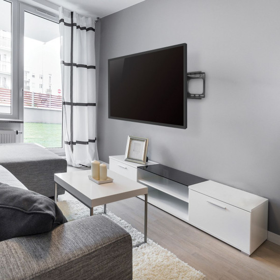 The BLACK+DECKER 40 In. to 86 In. Full Motion Flat Panel Large Mount is easy to install and features cable management. It can extend up to 24 in. out from the wall. This full motion TV mount is designed for units 40 in. to 86 in. and can hold up to 130 lbs._