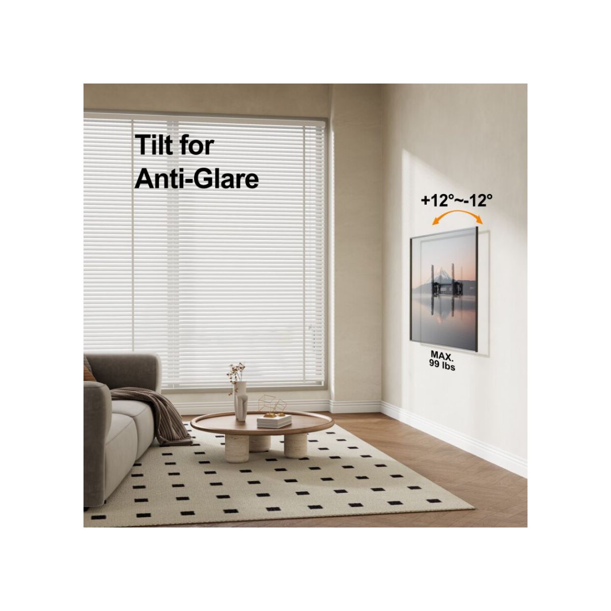 Featuring a simple yet effective tilt function, this mount allows you to easily tilt your TV ±12° for improved comfort and reduced eye strain. Whether you're watching from the couch, standing, or lying down, you can customize the angle to suit your needs. The low profile design (2.1" off the wall) keeps your TV close to the wall, providing a clean, modern look while saving space.