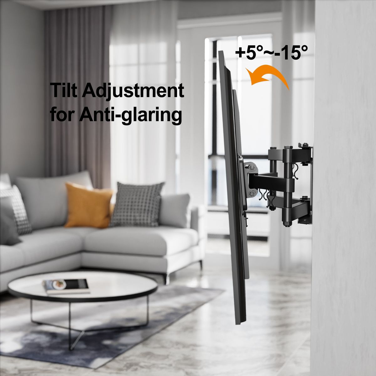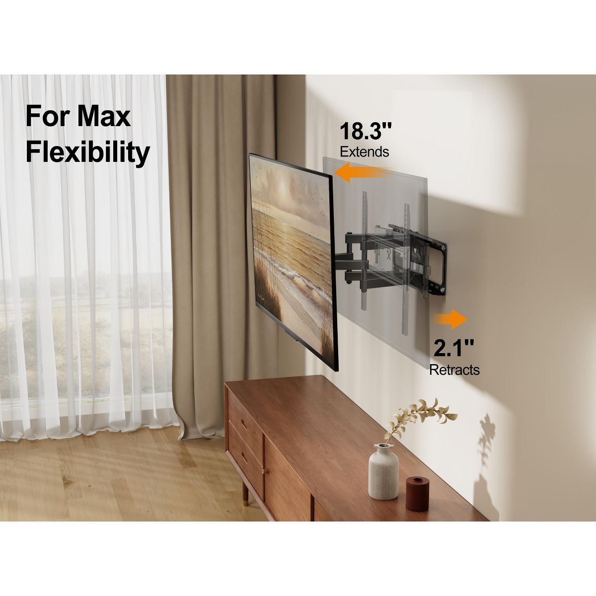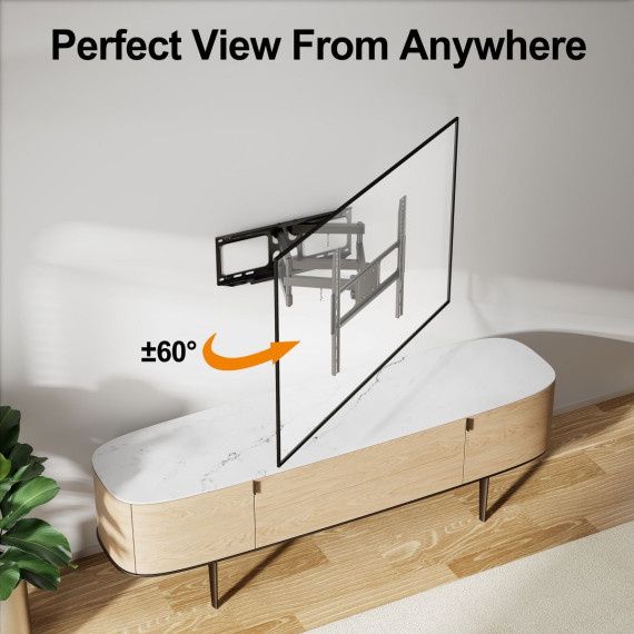 Featuring full-motion capabilities, this mount allows you to extend, swivel, tilt, and rotate your TV for the best viewing comfort. Adjust your TV up to 16 inches from the wall and swivel it 180° to the left or right, ensuring you can always find the perfect angle, no matter where you're sitting. The +/- 15° tilt function also helps reduce glare and improves viewing comfort.