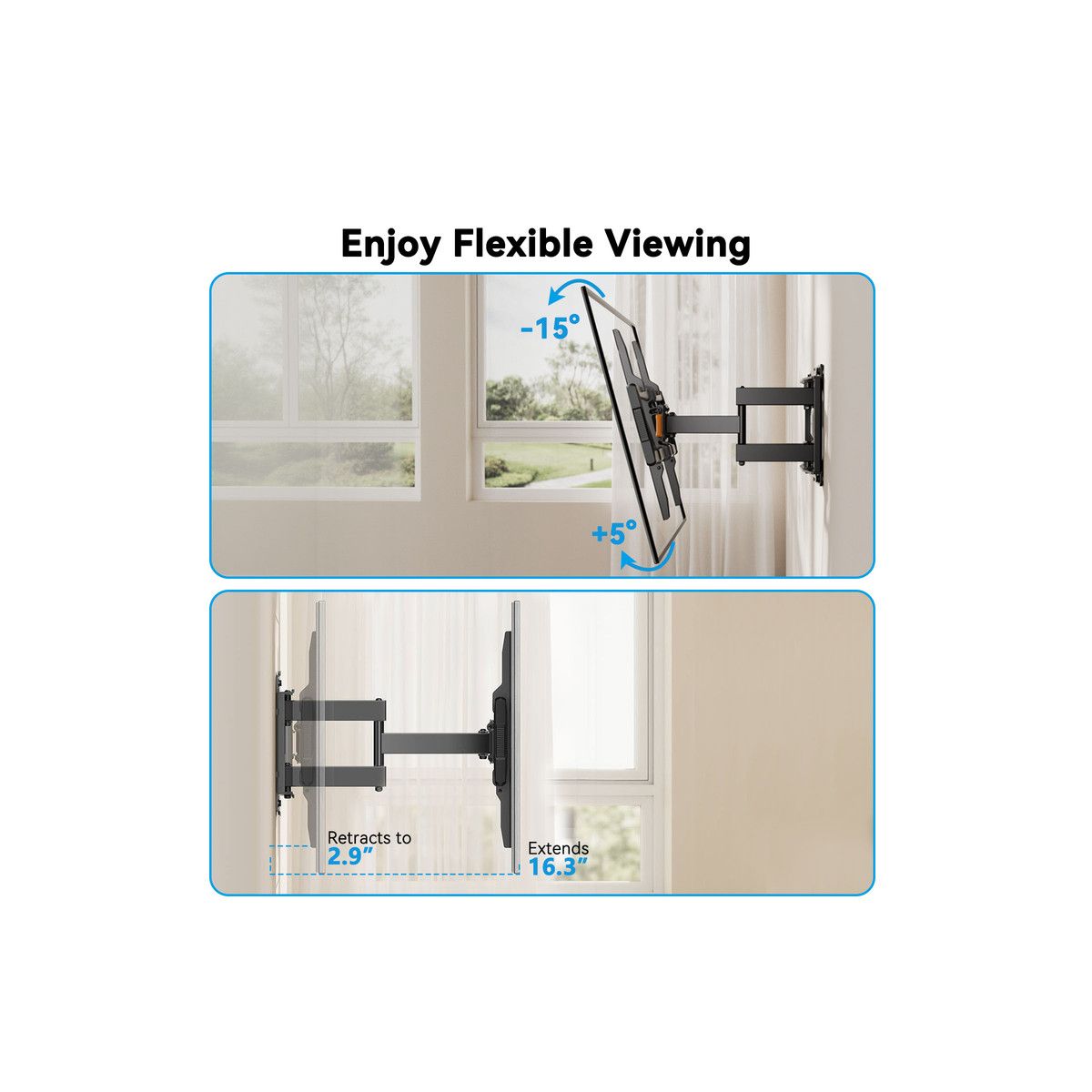 Perfect Fit for Large TVs: The articulating TV mount is the perfect mounting solution for 40 In to 86 InTVs with VESA patterns 200 x 100mm to 600 x 400mm. The wall mount TV bracket can be installed on 12 In/16 In wood studs, solid concrete, or brick walls.