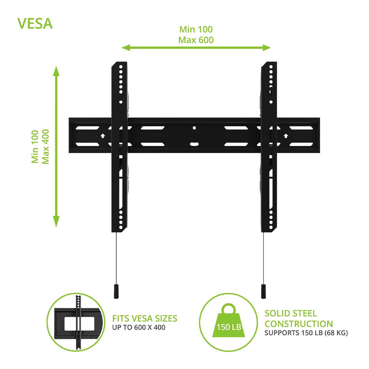 •Accomodates VESA sizes from 100x100 to 600x400
