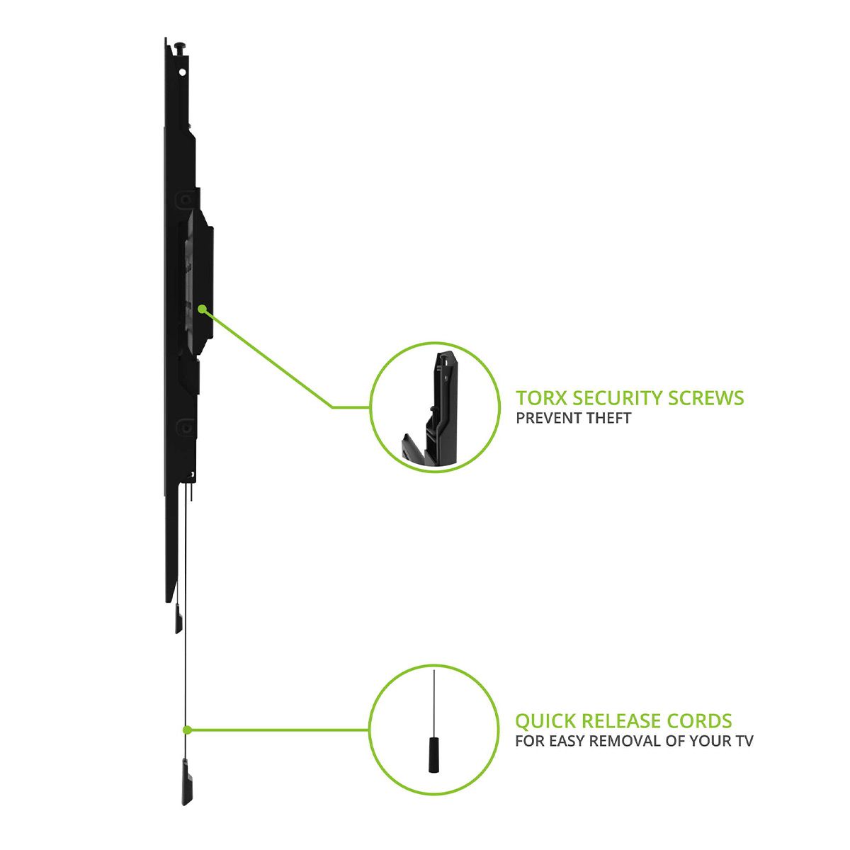 Magnetic Quick Release CordsRemoving your TV from the wall is as easy as pulling on two quick-release cords. Each cord includes a magnetic end allowing them to be neatly tucked out of sight.