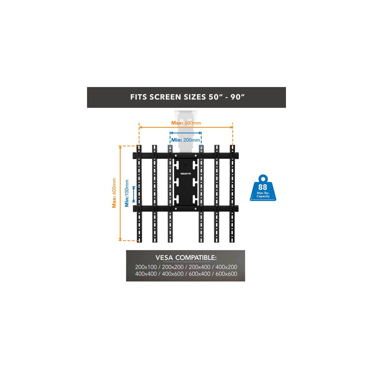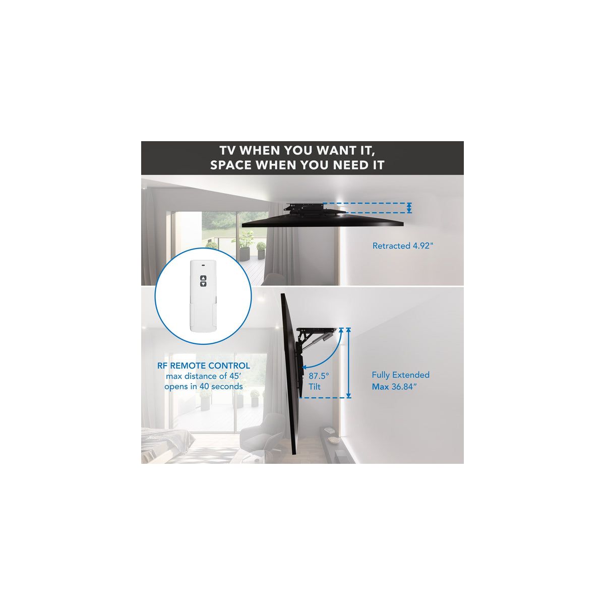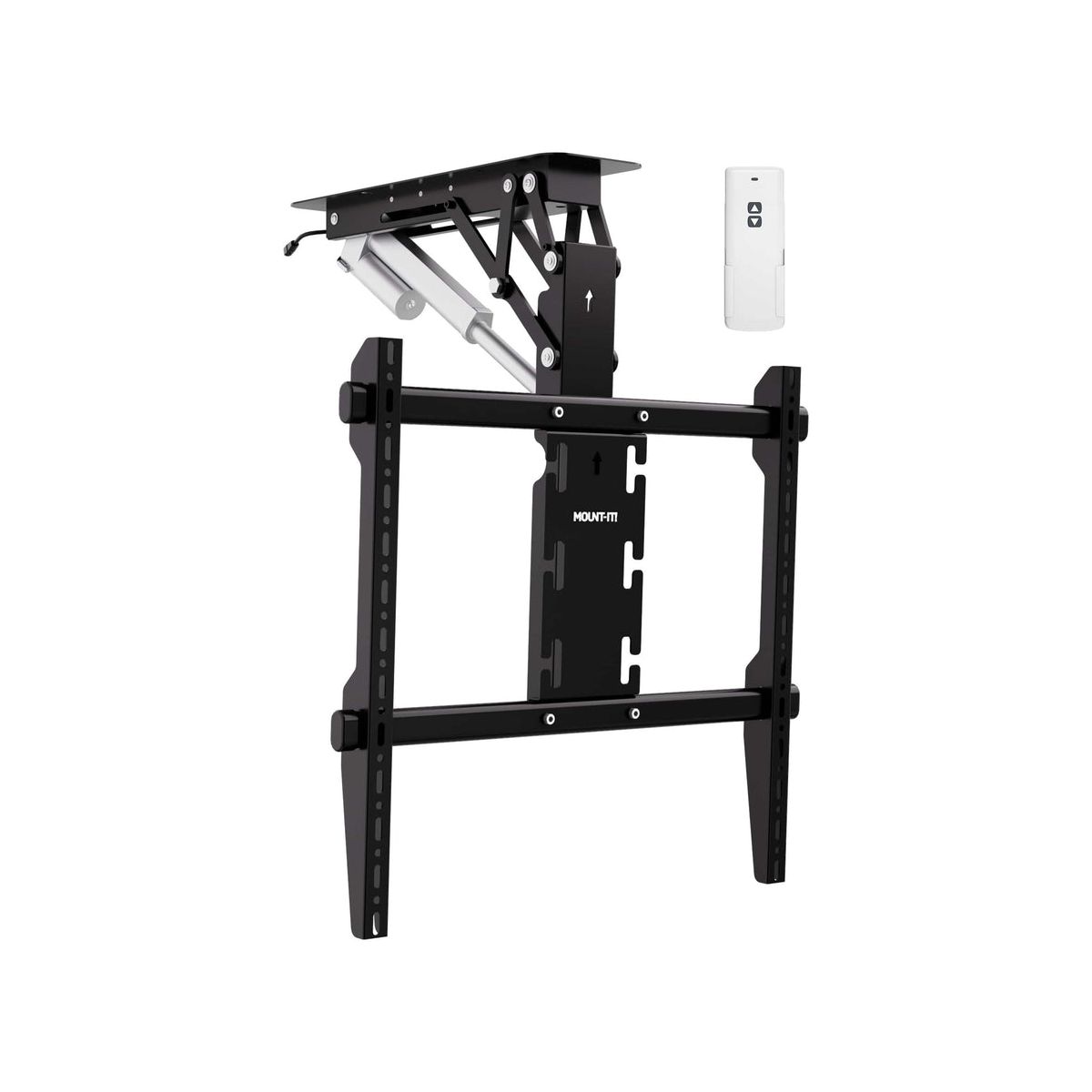 Elevate your viewing experience with our motorized TV ceiling mount, engineered to bring both functionality and style to any space. This sophisticated mount is perfect for effortlessly raising or lowering your TV with the included remote control, optimizing viewing angles and neatly tucking the TV away when not in use. Designed to support large screens ranging from 50'' to 90'' and capable of handling weights up to 88 lbs, it's the ideal solution for expansive display setups. With universal VESA compatibility from 200x200 to 600x600, it easily fits most TV models, ensuring a wide range of applications. The durable steel construction guarantees that your TV stays securely mounted, providing peace of mind in any installation. Available in elegant black or white finishes, this ceiling mount seamlessly blends with any room's decor, enhancing your space with a sleek, modern look. Whether it's used in residential homes to save space and enhance living rooms or bedrooms, in corporate boardrooms to facilitate presentations, or in commercial settings like hotels and restaurants where aesthetics and functionality are paramount, this electric TV ceiling mount offers a premium solution that combines convenience with style.