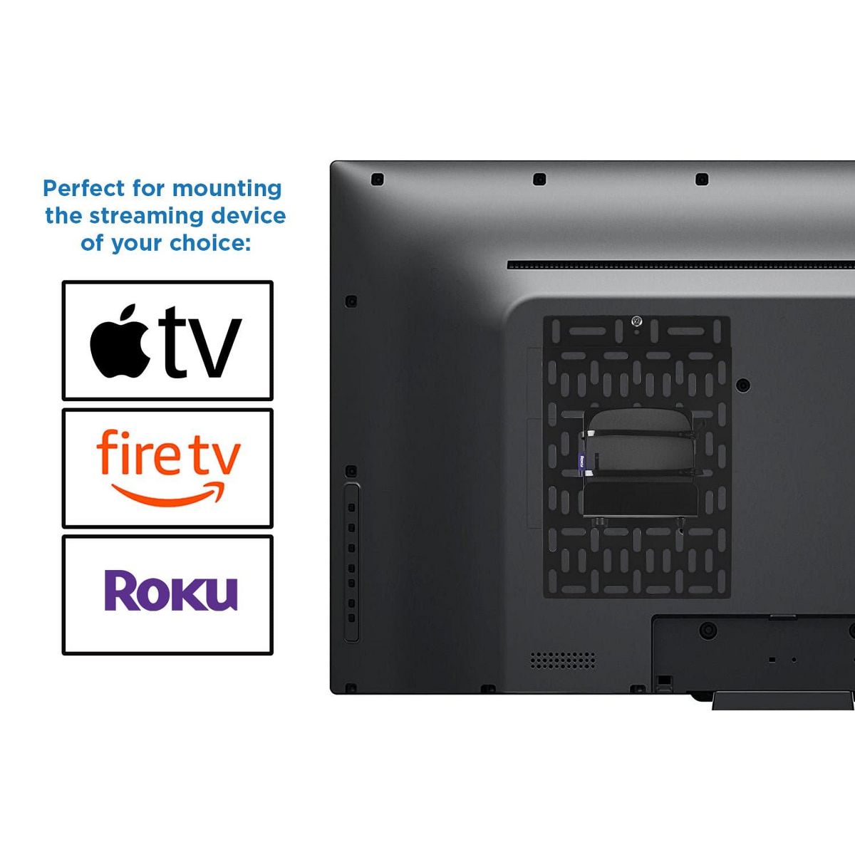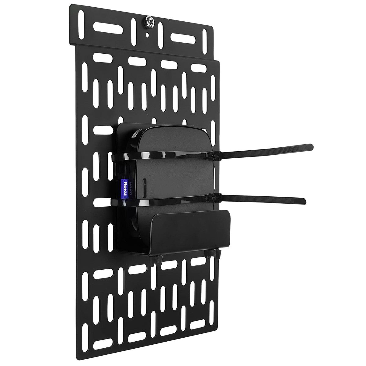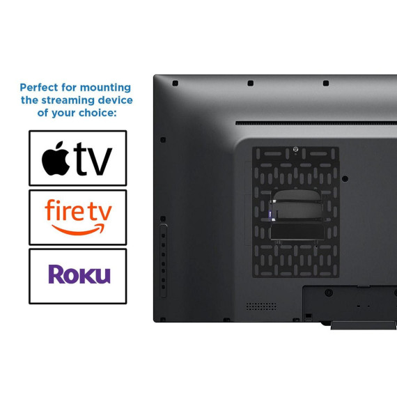 The MI-356 streaming device mount keeps your devices organized and mounts behind a TV or the wall. Compatible with Apple TV, Amazon Fire TV, Roku, TiVo, and other players, it hides the device behind your TV for a clean look without any clutter. The width adjustment knobs allow the mount to fit securely around your device. High-strength steel and cable ties ensure your media device is securely connected to the mount. It can also be used to mount routers, modems, and small gaming consoles or cable boxes.