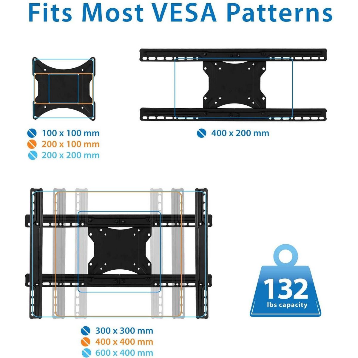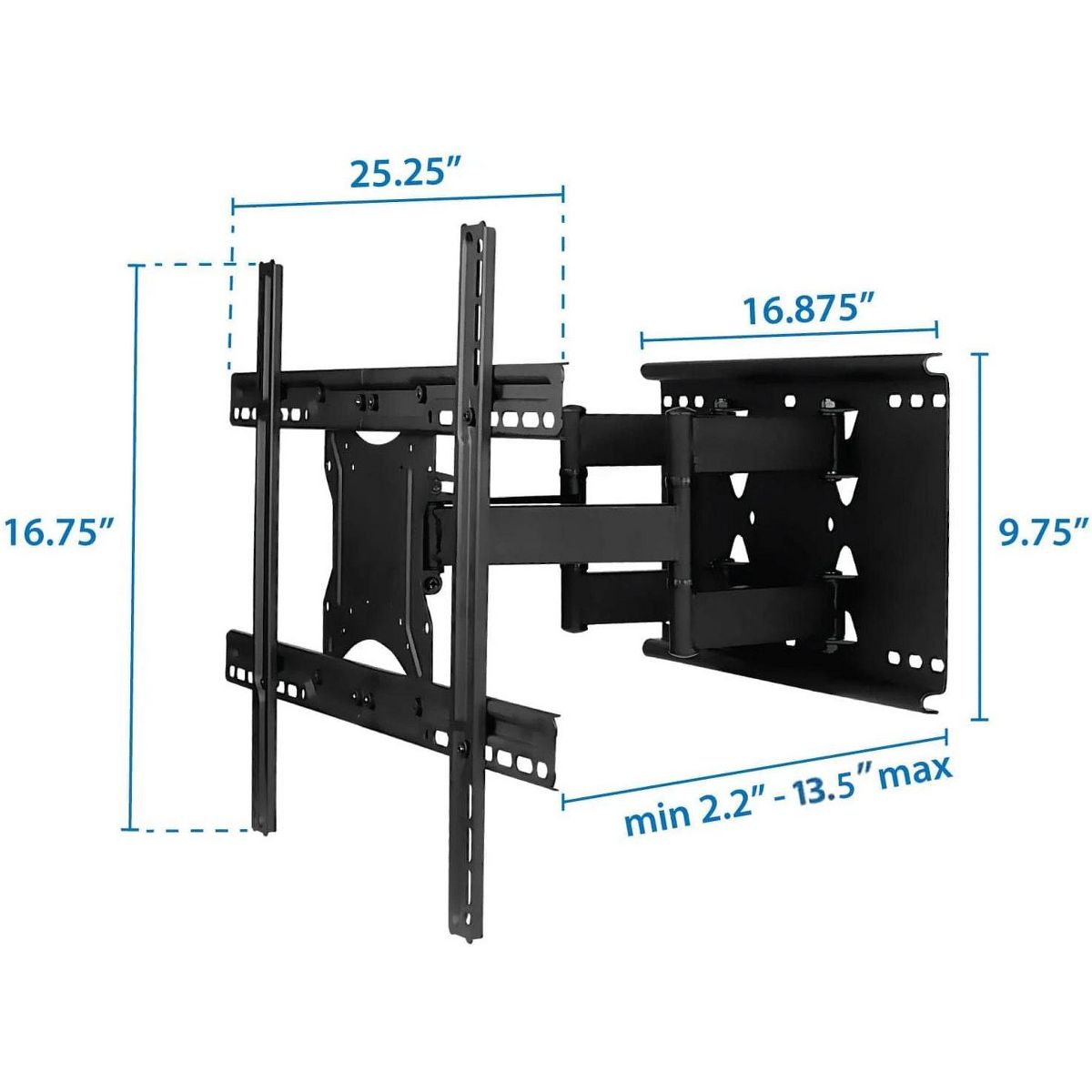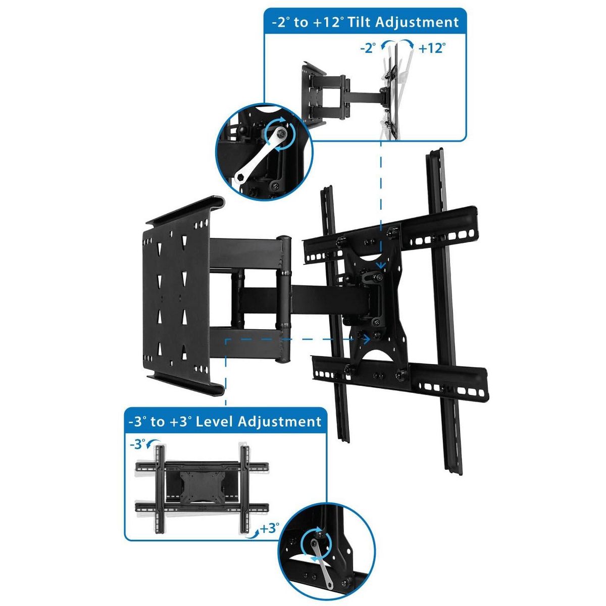 The MI-385 is a heavy-duty mount that is perfect for large screen TVs. With a weight capacity of up to 132 lbs., it can support most large screen TVs up to 80." The full-motion design makes this mount ideal for corner installations, over a fireplace, or inside a TV center. Swivel or tilt the mount to find the perfect viewing angle. Low-profile design will look sleek on your wall, or extend it out up to 18" to suit any room configuration.