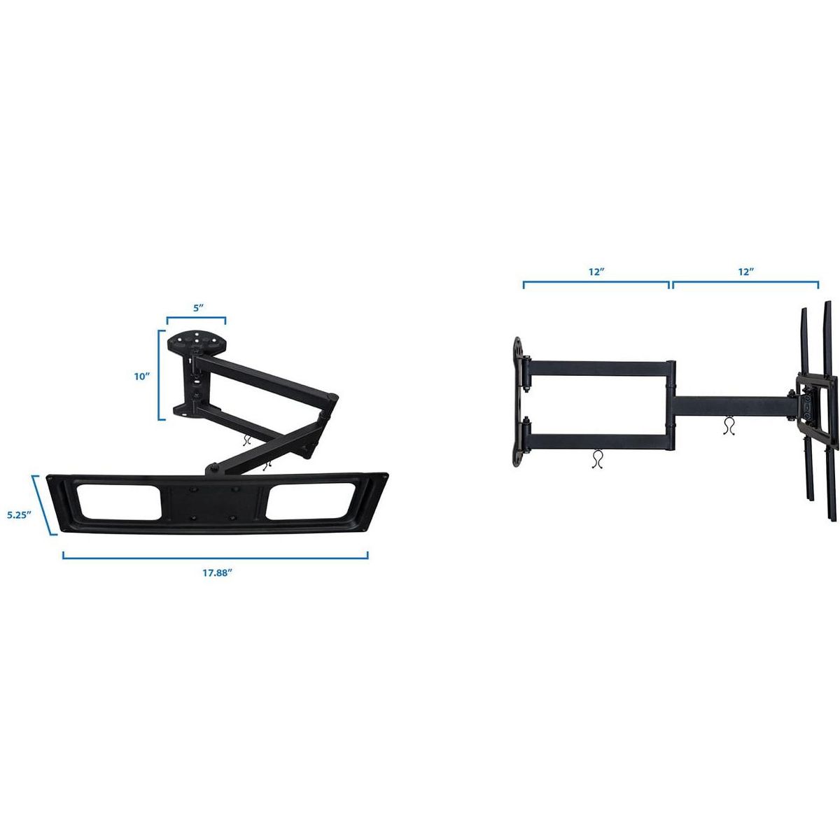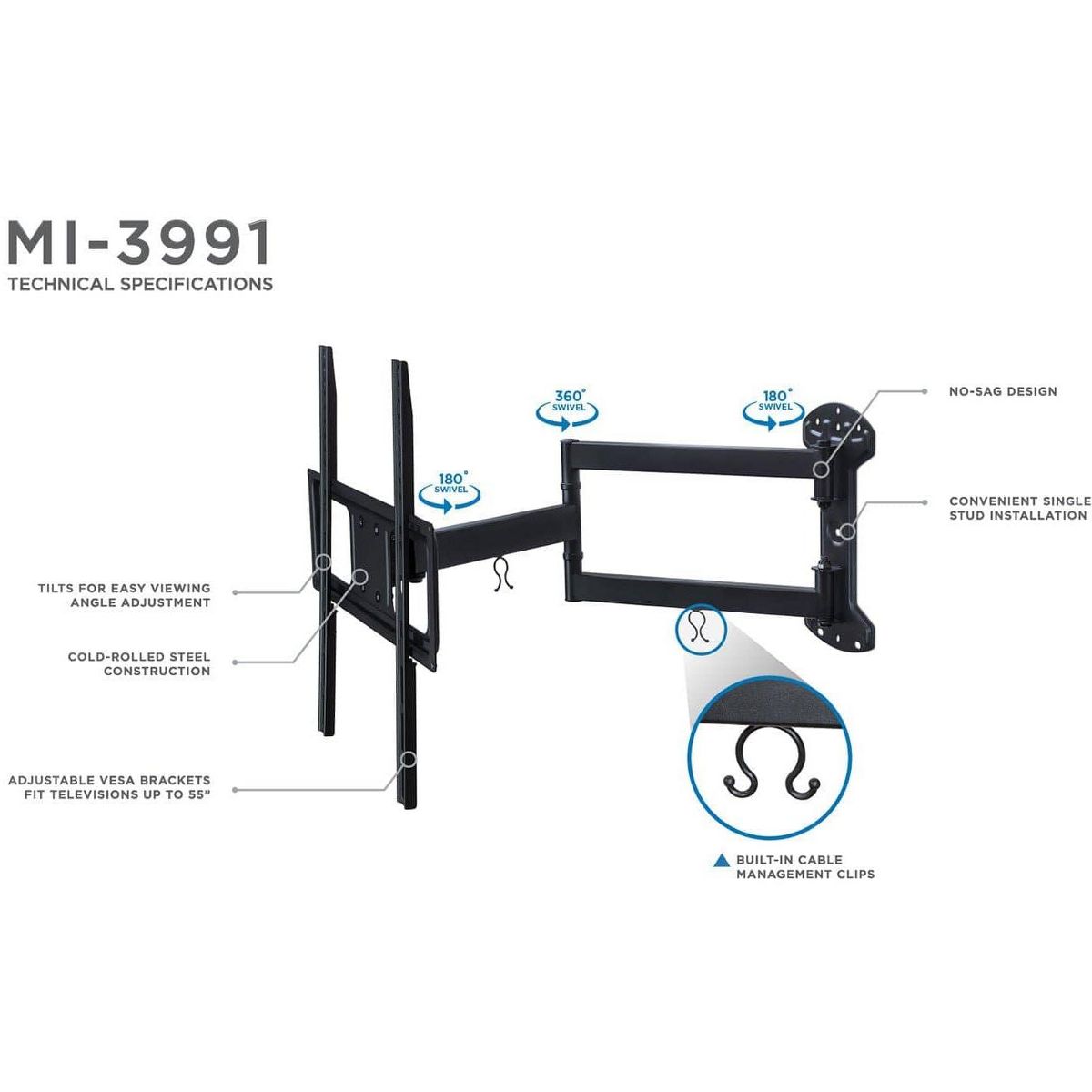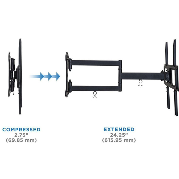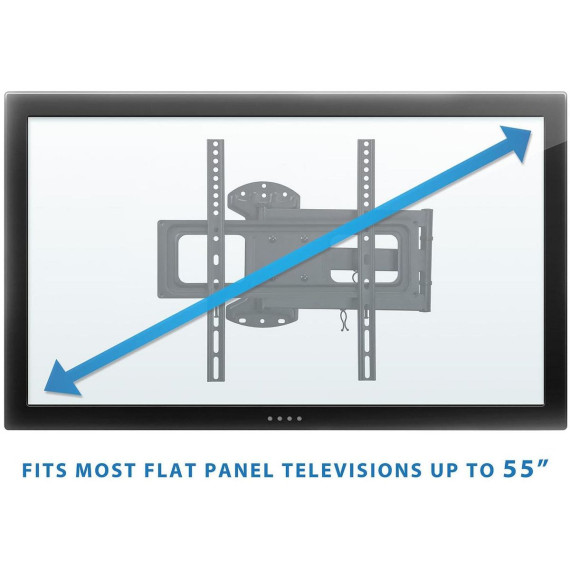 The MI-3991XL is an ideal mount for entertainment centers and cornet installations. The long extension arm extends out to 24" from the wall to improve your viewing experience. Full motion tilt and swivel features help you get the perfect angle. High strength steel means this mount can hold heavy loads up to 77 lbs. The cable management clips keep your space clean and organized. Includes all necessary mounting hardware. Anchor included is only for concrete wall installation NOT for drywall application.