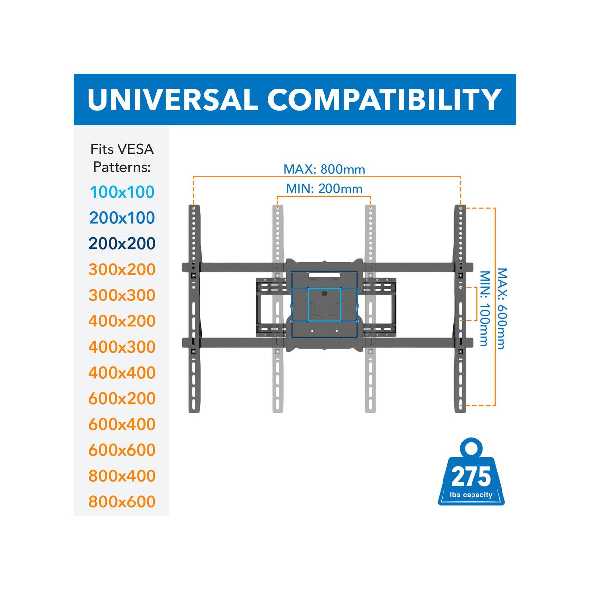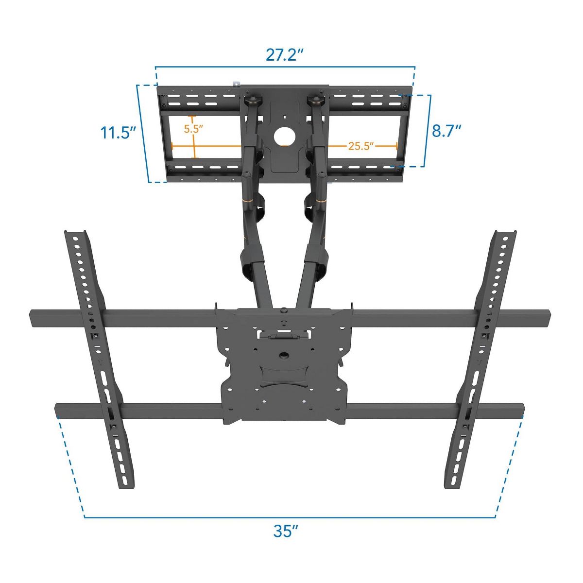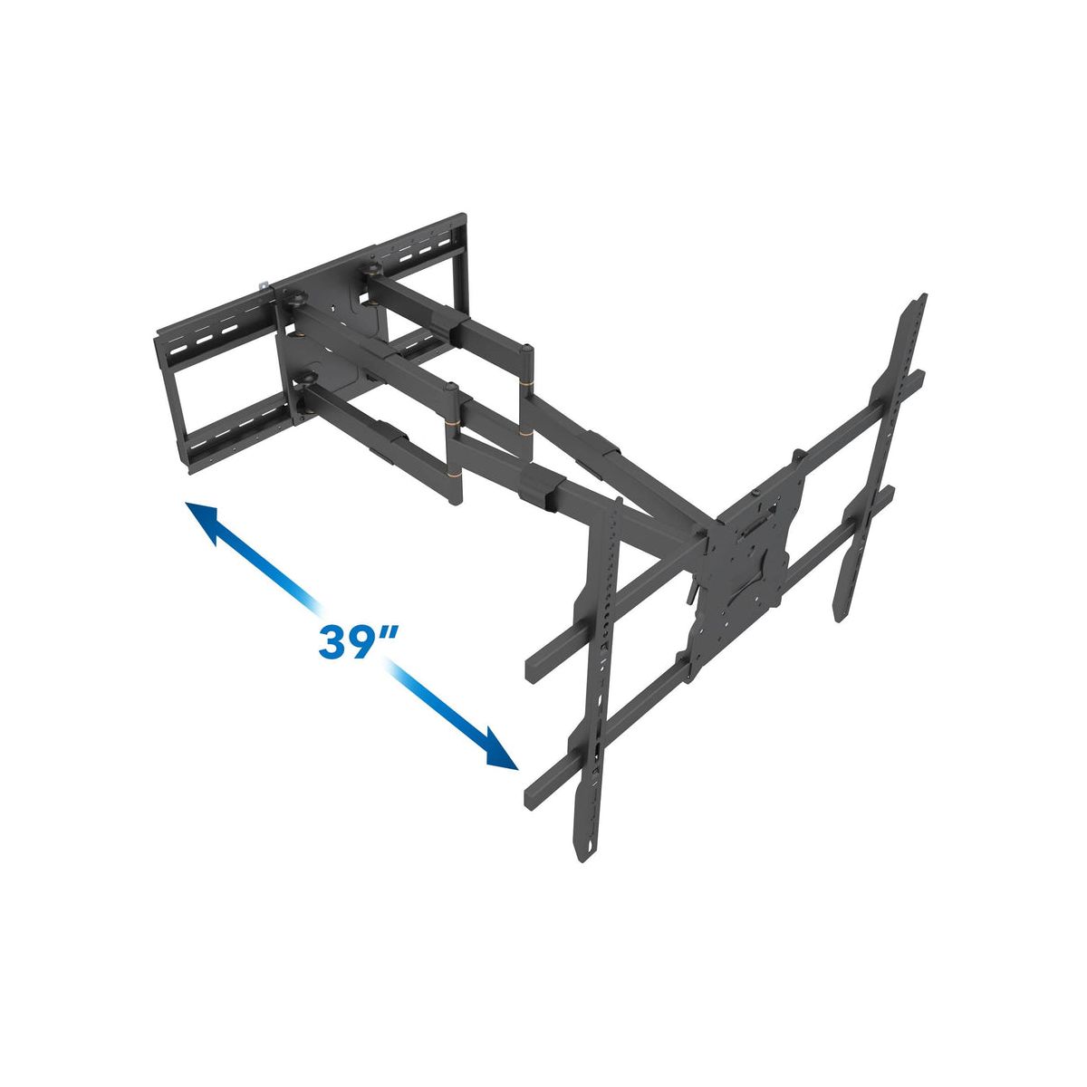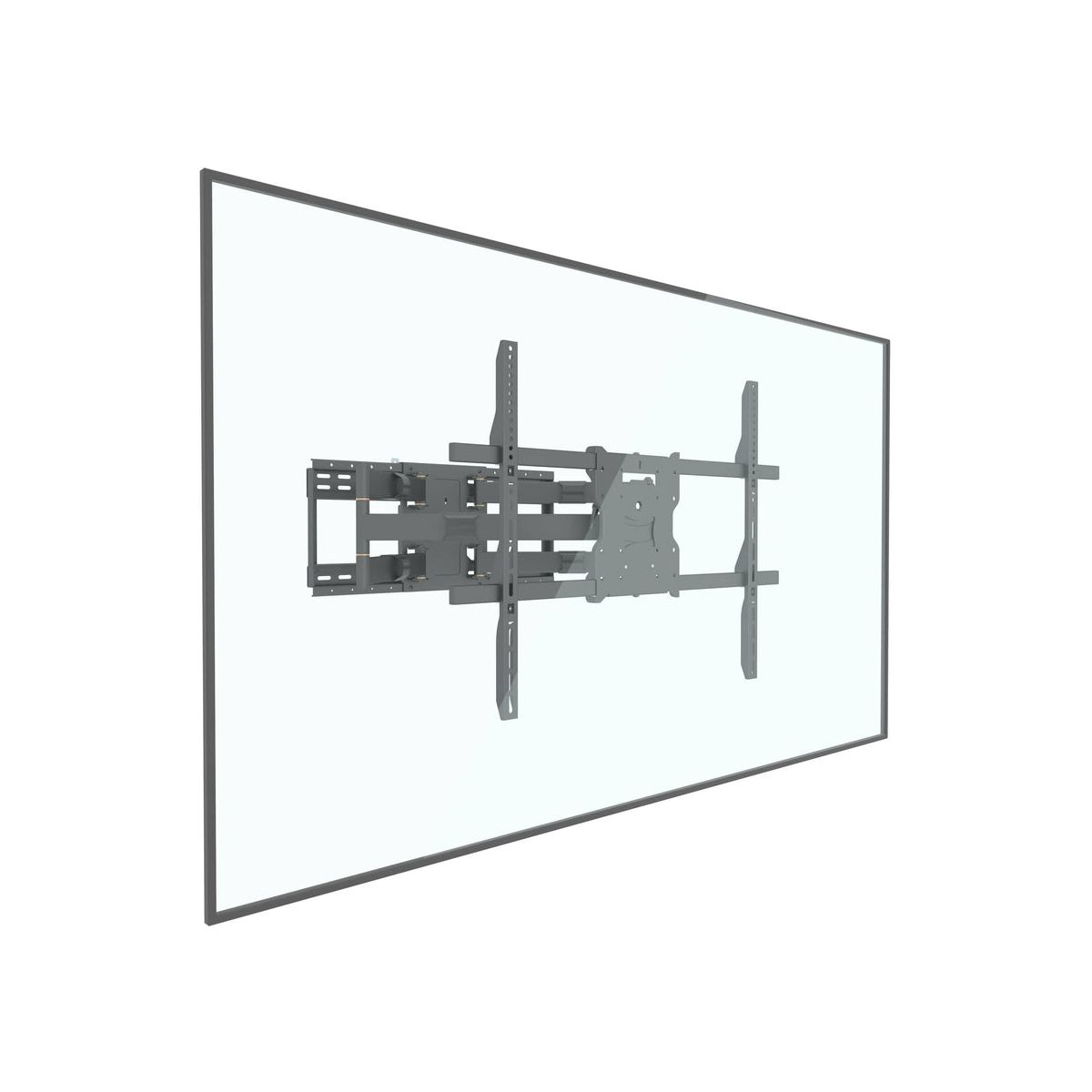 There is a reason why we call this mount the Beast! This heavy duty and durable articulating wall mount is the ultimate in Full Motion TV Wall Mounting. It is designed to provide stability for an extra-large, extra heavy flat screen TV up to 110 inches and 275 lbs. Its articulating mount allows for full rotation, enabling you to keep your TV centered in any position on the wall for ultimate viewing pleasure. Arm extension reaches up to 39 inches and fits 16 24 inch studs with a large 800 x 600mm VESA pattern.