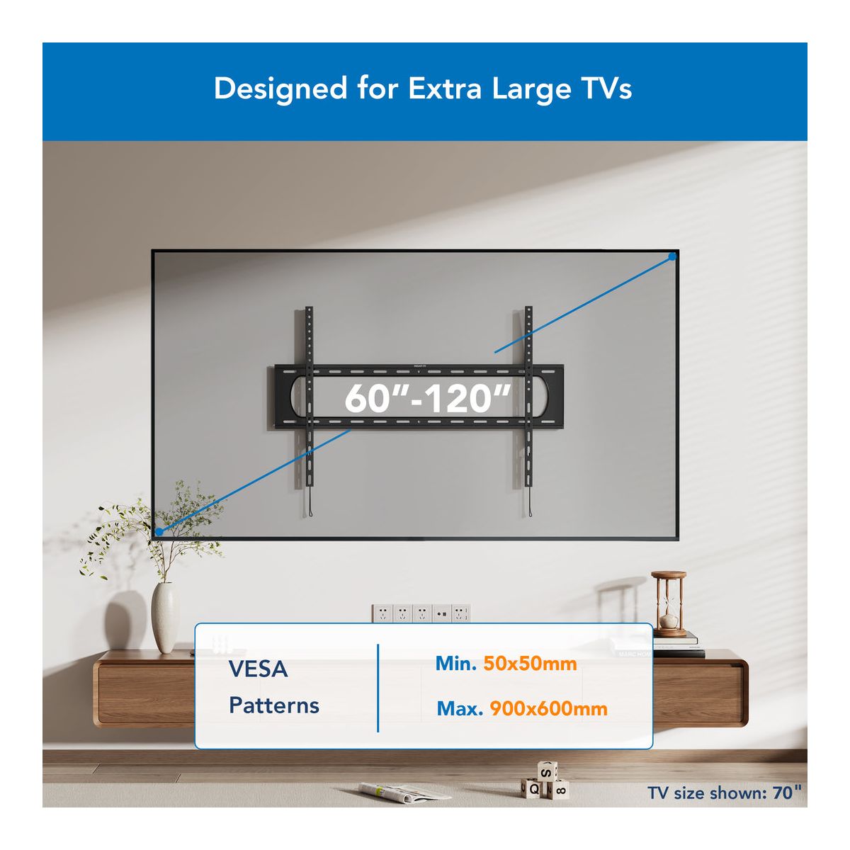 Elevate your home entertainment experience with our Heavy Duty XXL Fixed TV Wall Mount, designed to provide a minimalist aesthetic with its ultra-low 1.4" profile. Crafted from sturdy steel, this wall mount features an extra wide wall plate that securely holds even the largest TVs on the market, accommodating screens ranging from 60" to 120". With an impressive weight capacity of 264 lbs, you can trust in the stability and security of your mounted TV. The extensive VESA compatibility, spanning from 50x50 to a generous 900x600, ensures flexibility in accommodating various TV sizes including curved screens. Installing your TV becomes a breeze - all hardware as well as an installation template and a bubble level for accuracy are included.