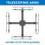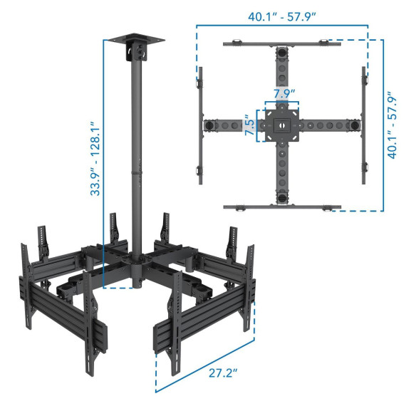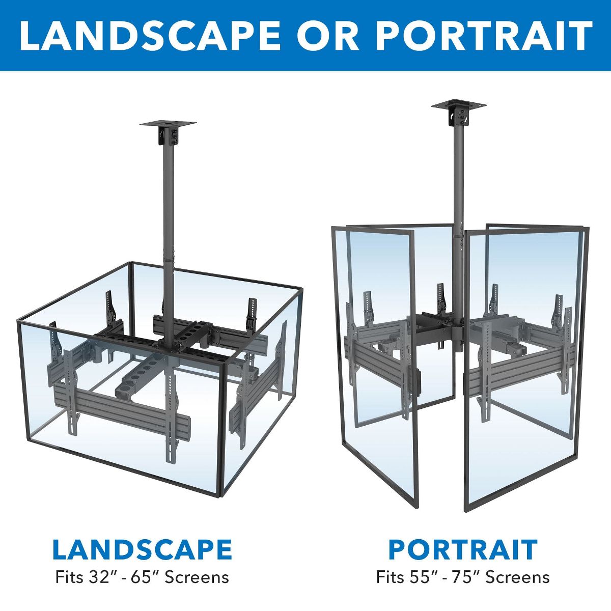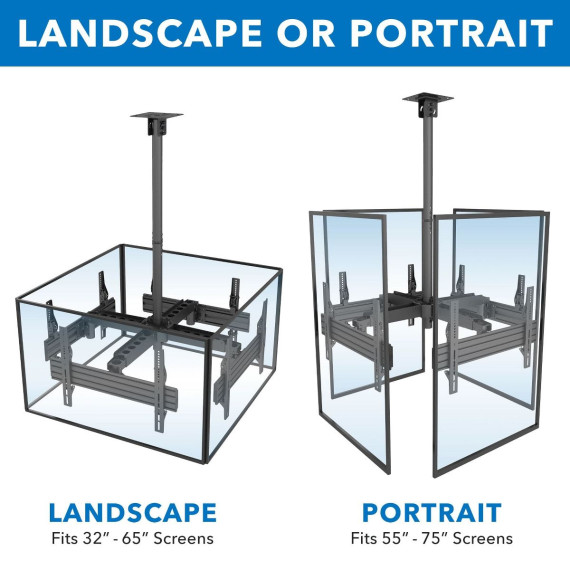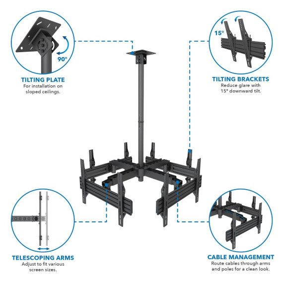 Use this mount to place information or entertainment where it can easily be seen, regardless of wall space. Make content viewable from any point in your facility with this 360 digital signage display mount. Four telescoping mounting arms can hold four screens evenly spaced in a square or rectangular configuration, helping you create the ideal multi-display ceiling mounted solution. Displays can be mounted in landscape or portrait orientation.Each arms adjustable depth allows the installer to set the spacing between each display to meet your applications needs. With 360 of swivel, and 15 degrees of tilt, this mount creates the perfect viewing angle for any application. Four modular pole pieces allow height adjustment between 33.9 inches to 128.1 inches from the ceiling.