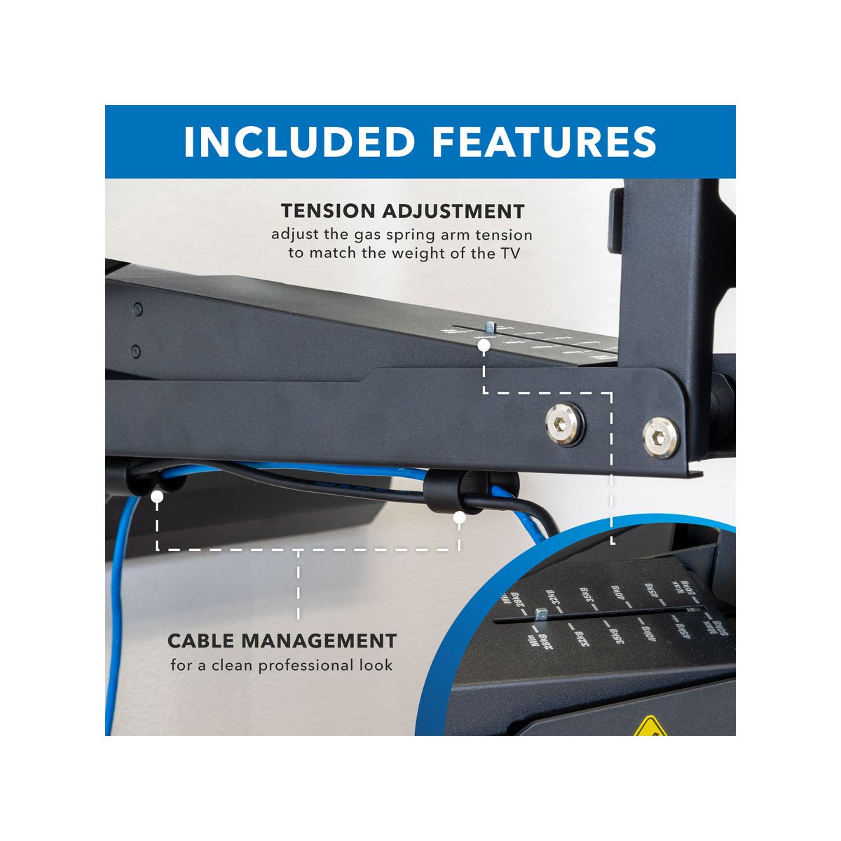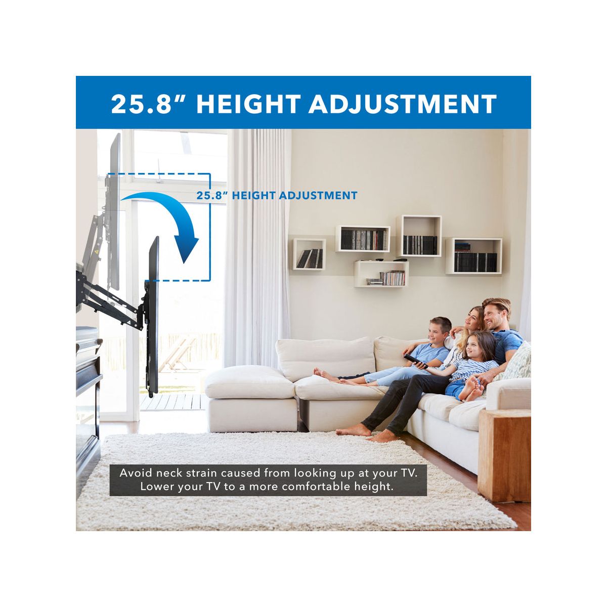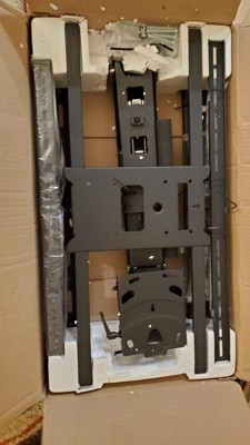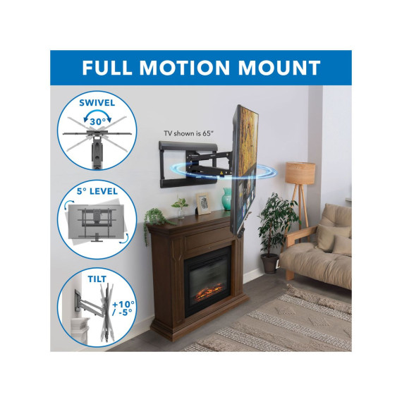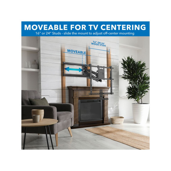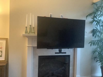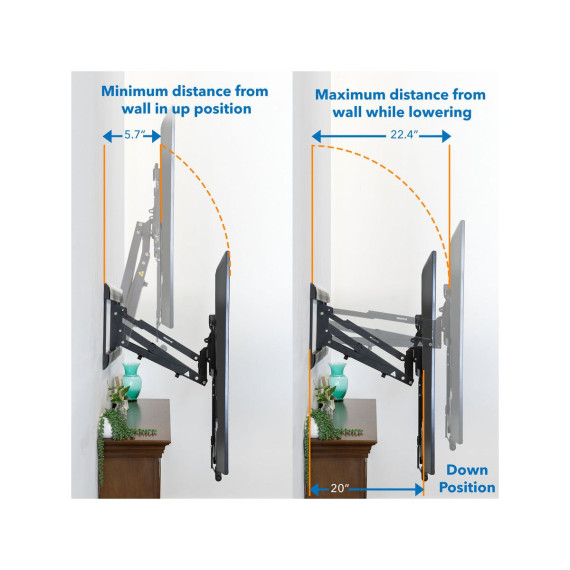 MI-384 fireplace TV mount was designed to solve the typical problem of installing TVs above the fireplace. With the 29" height adjustment, you can pull your TV down to a comfortable viewing height and then put it back in place when you're done. The cushioned, insulated handles are protected from fireplace heat, preventing burns. The gas spring mechanism offers a counterbalance to the weight of the TV, allowing it to be lowered and raised with the touch of a finger. Swivel and tilt features help you precisely align your TV. Note that only TVs size 60" and larger will cover the entire mount in the upper position. With TVs smaller than 60" parts of the mount may be exposed.