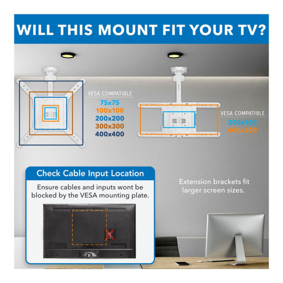 You have a slanted wall and need to mount your TV or you like your TV neatly stowed away when not in use? Then this flip down ceiling TV mount is the right solution for you! It fits television screens between 23 and 55 inches and up to 44lbs. When your TV is not in use, you can fold it away and lock it securely in place. To achieve the perfect viewing angle, this TV mount allows you to swivel your screen +/- 45 degrees. The extendable VESA plate fits all standards between 75 x 75 and 400 x 400 mm and can be easily removed from the pole. This compact ceiling mount is suitable for a variety of environments including living room, bedroom, office, school or gym.