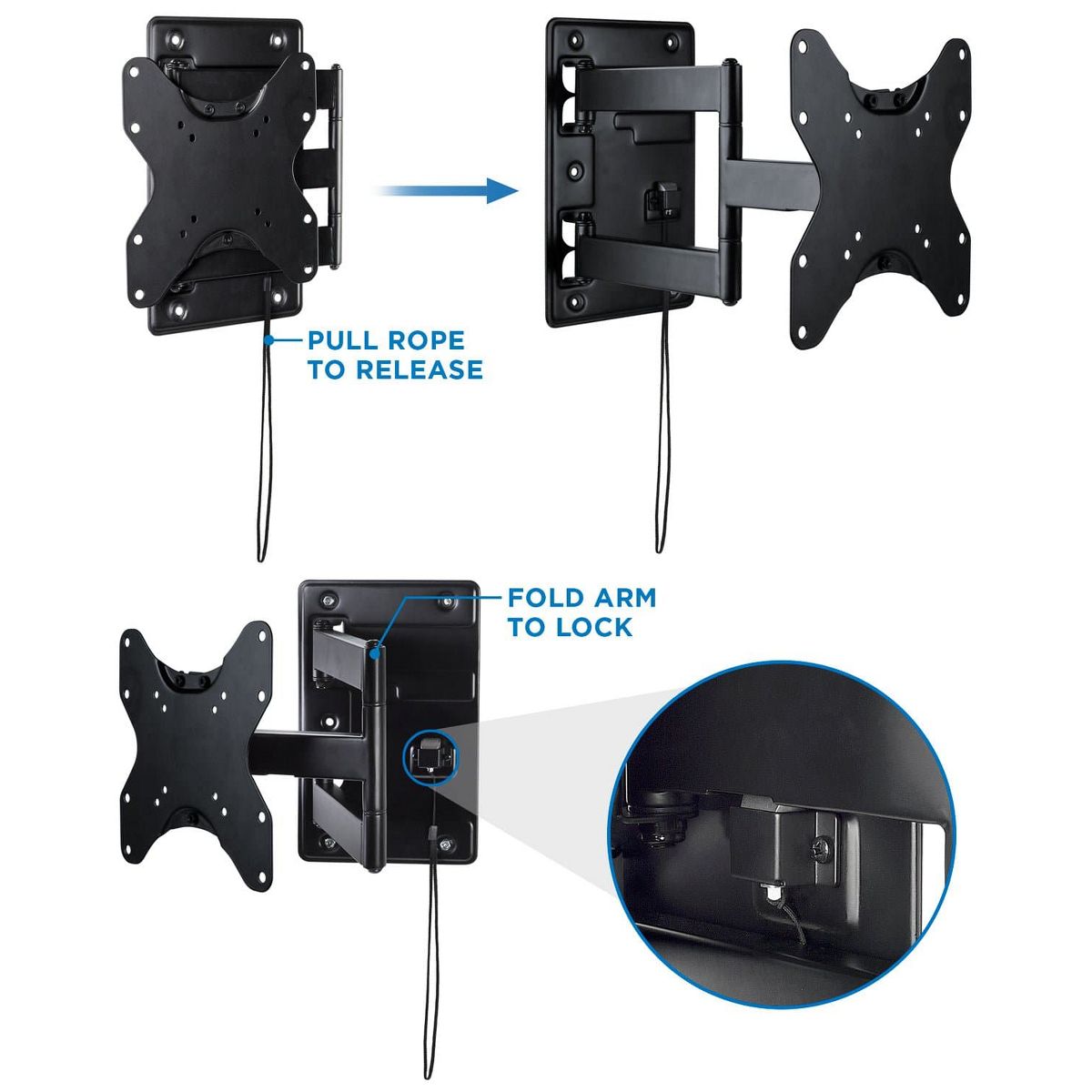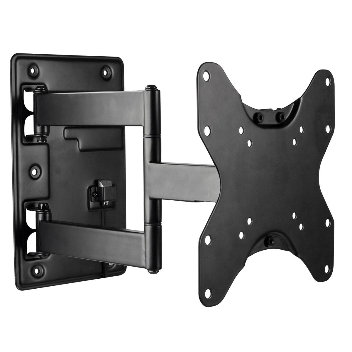 This full motion TV mount is specifically designed to keep your TV safely stowed away while your motorhome, vehicle or boat is moving. When you reached your destination and are ready to kick back for a movie, simply pull down on the quick release loop, and extend the cantilever arm. This mount can tilt, swivel, extend, and retract to be positioned in almost any viewing angle. This heavy-duty steel frame supports up to 77 lbs. and the VESA extender plates accommodate larger TVs from 23" to 42" screen sizes. The detachable VESA head bracket makes it convenient to remove the entire TV for long term storage.