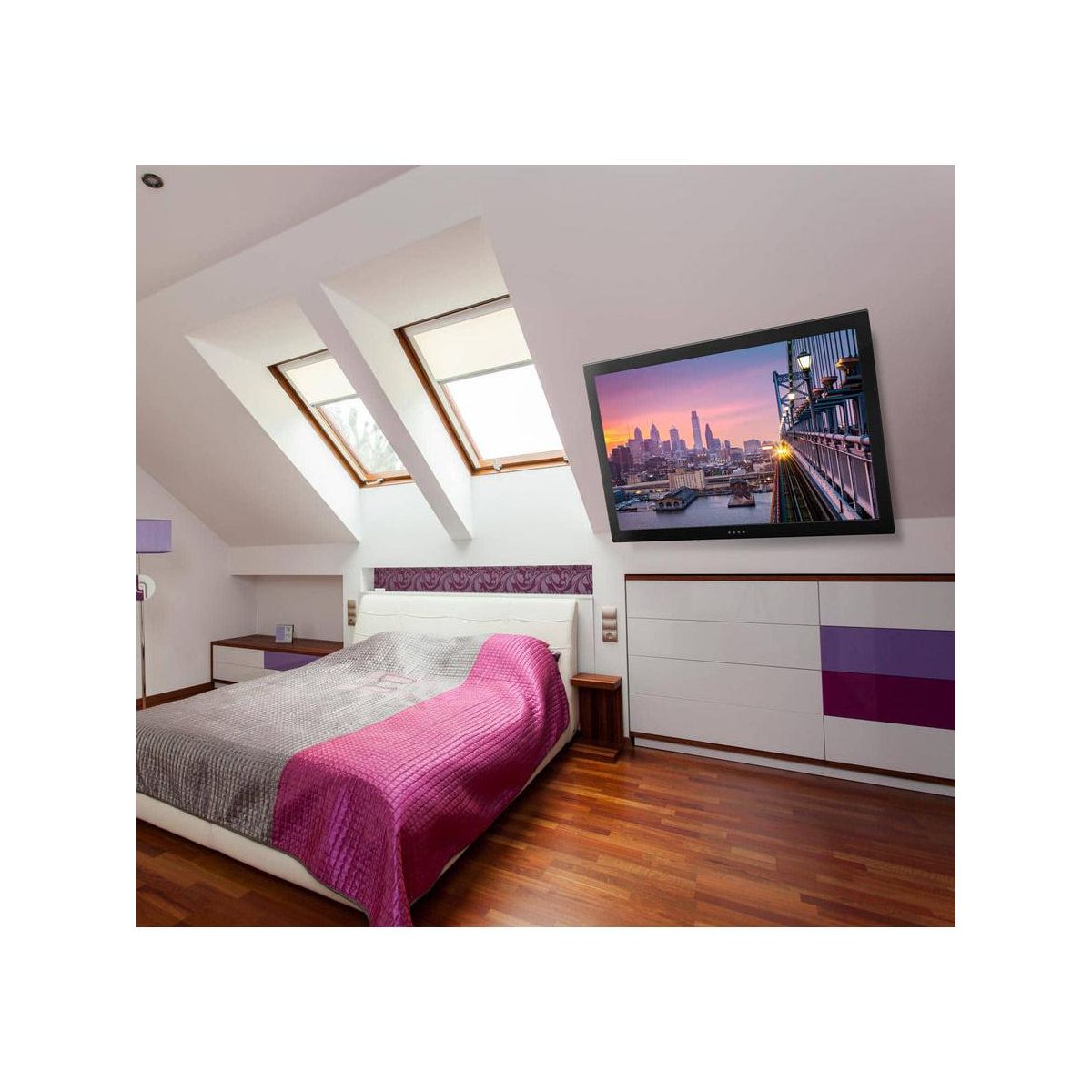 This full-motion motorized TV mount keeps the TV tucked away and out of sight when not in use. Fold it down when it's time to watch with the use of the included remote control. This mount features a 0 to 75-degree tilt and works great on both a flat and pitched ceiling, providing more versatility to adapt to more spaces. A manual height adjustment of the ceiling mount can be made to ensure a comfortable viewing angle of your TV screen. It can hold up to 66lbs and fits most TV brands from 23" to 55".This flat screen TV ceiling mount comes with an instruction manual for easy installation. The powerful electric motor is surrounded by strength tested steel, making this one of our most durable TV accessories. Get your Mount-It! motorized TV wall mount today!