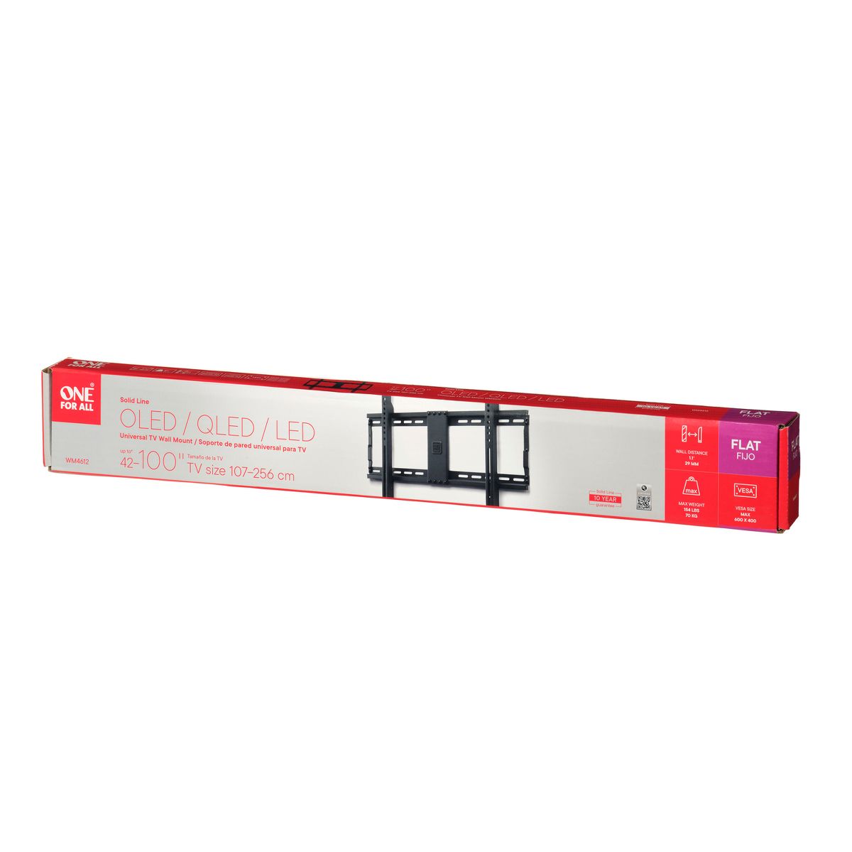 This One For All® Fixed TV Wall Mount fits most televisions from 42 in. to 100 in. and is compatible with VESA® sizes up to 600 x 400. This low-profile wall mount allows fixed wall-to-TV distance of only 1.1 in. (29 mm). The SOLID line of wall mounts features a robust design. All mounting materials are delivered with the TV wall mount for an easy installation._