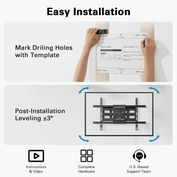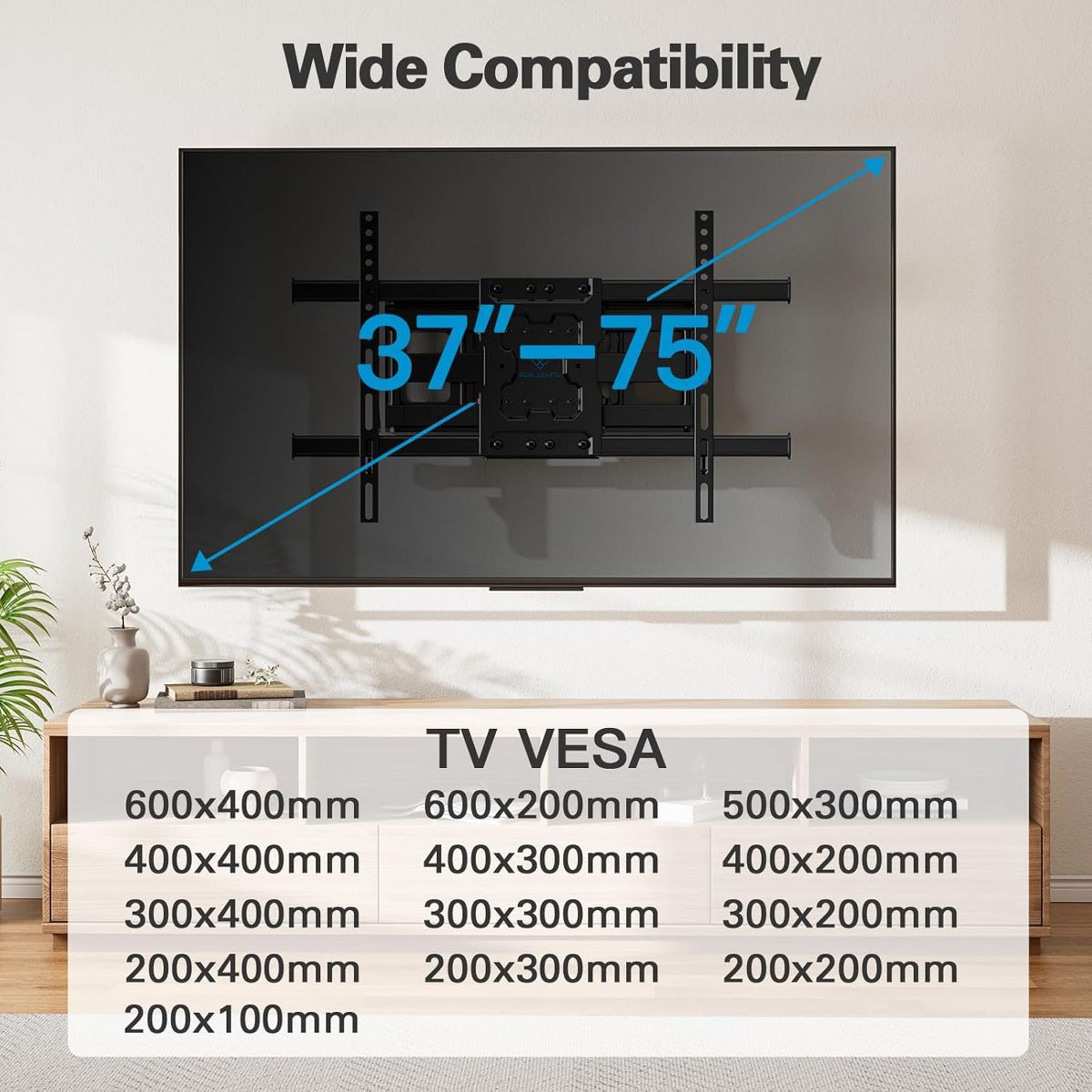 Wide TV Wall Mount: This PERLESMITH heavy-duty full motion TV wall mount fits most 37-75 inch flat/curved TVs with VESA 200x100mm to 600x400mm. The 65 inch TV wall mount can be installed on 12/16 In wood studs, solid concrete, or brick walls. Please do not mount on drywall alone.