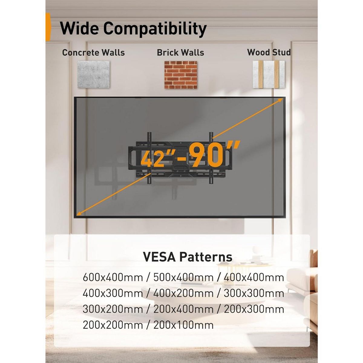 Perlesmith UL Listed Full Motion TV Wall Mount for 42-90" TVs up to 150 lbs, Pre-Assembled, Tool-Free Tilt, Swivel & Extension, Max VESA 600x400mm