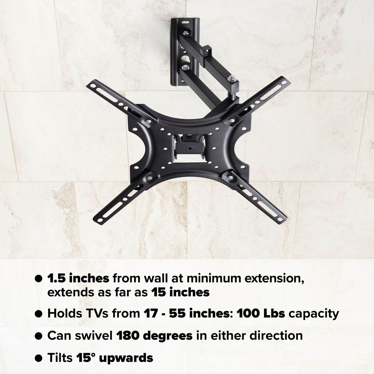 Featuring full-motion capabilities, this mount allows you to extend, swivel, tilt, and rotate your TV for the best viewing comfort. Adjust your TV up to 16 inches from the wall and swivel it 180° to the left or right, ensuring you can always find the perfect angle, no matter where you're sitting. The +/- 15° tilt function also helps reduce glare and improves viewing comfort.