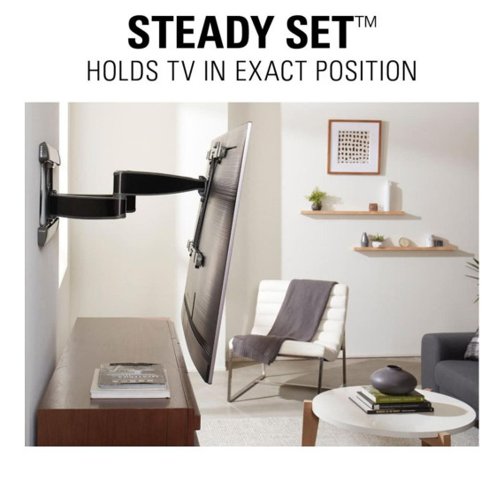 Expertly engineered with FluidMotion design the Advanced Full-Motion Mount provides unparalleled smoothness. Effortlessly extend tilt and swivel your TV regardless of its weight or thickness. The mounts included Steady Set functionality ensures your TV will stay exactly where you want it no drifting shifting or unwanted movement ever.