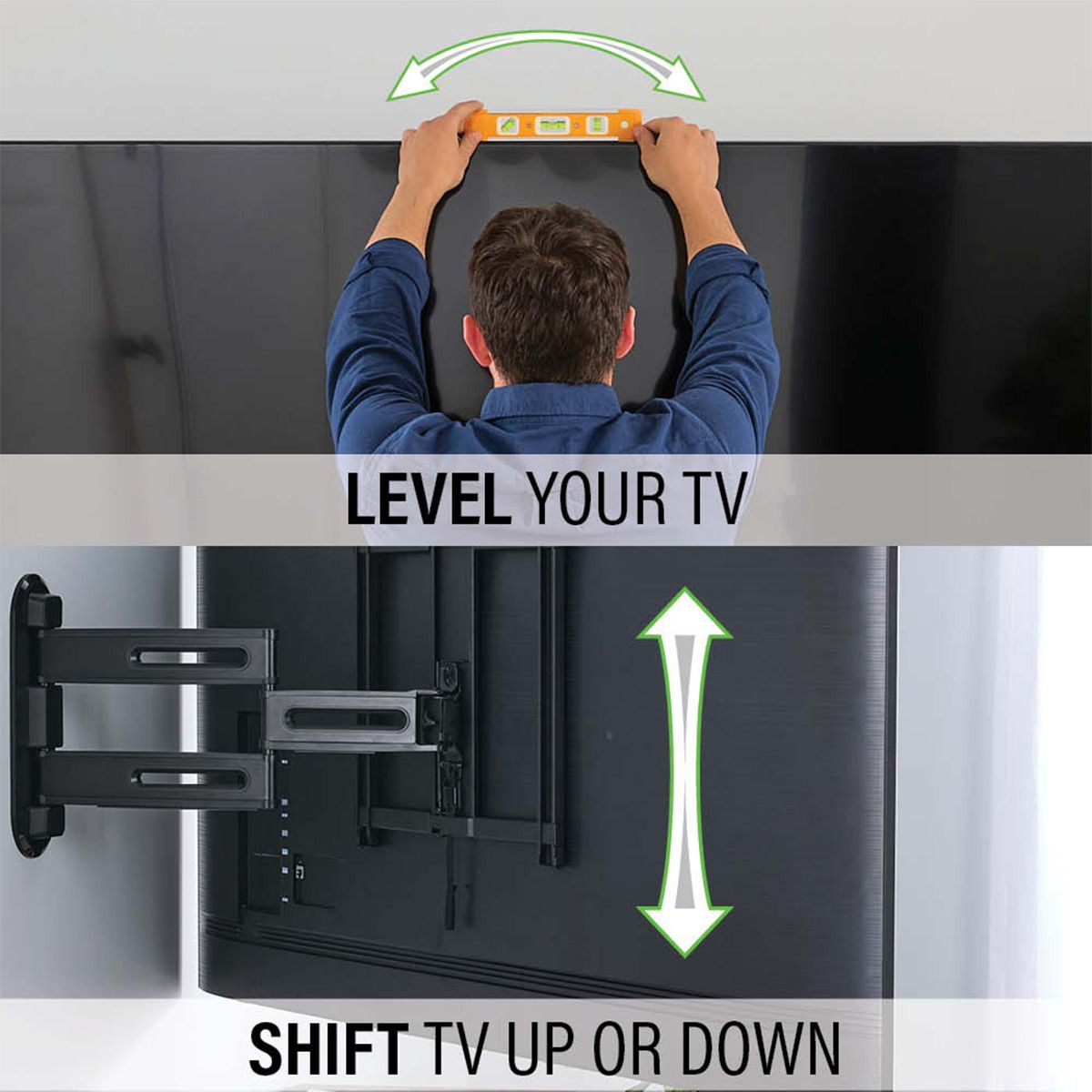 FluidMotionExpertly engineered with FluidMotion design the Advanced Full-Motion Mount provides unparalleled smoothness. Effortlessly extend tilt and swivel your TV regardless of its weight or thickness. With Virtual Axis easily reduce glare and reflections caused by lights or windows by tilting your TV up or down with the touch of a finger. If your TV requires any additional leveling once installed ProSet lets you make micro-adjustments to level after mounting to ensure perfect positioning.