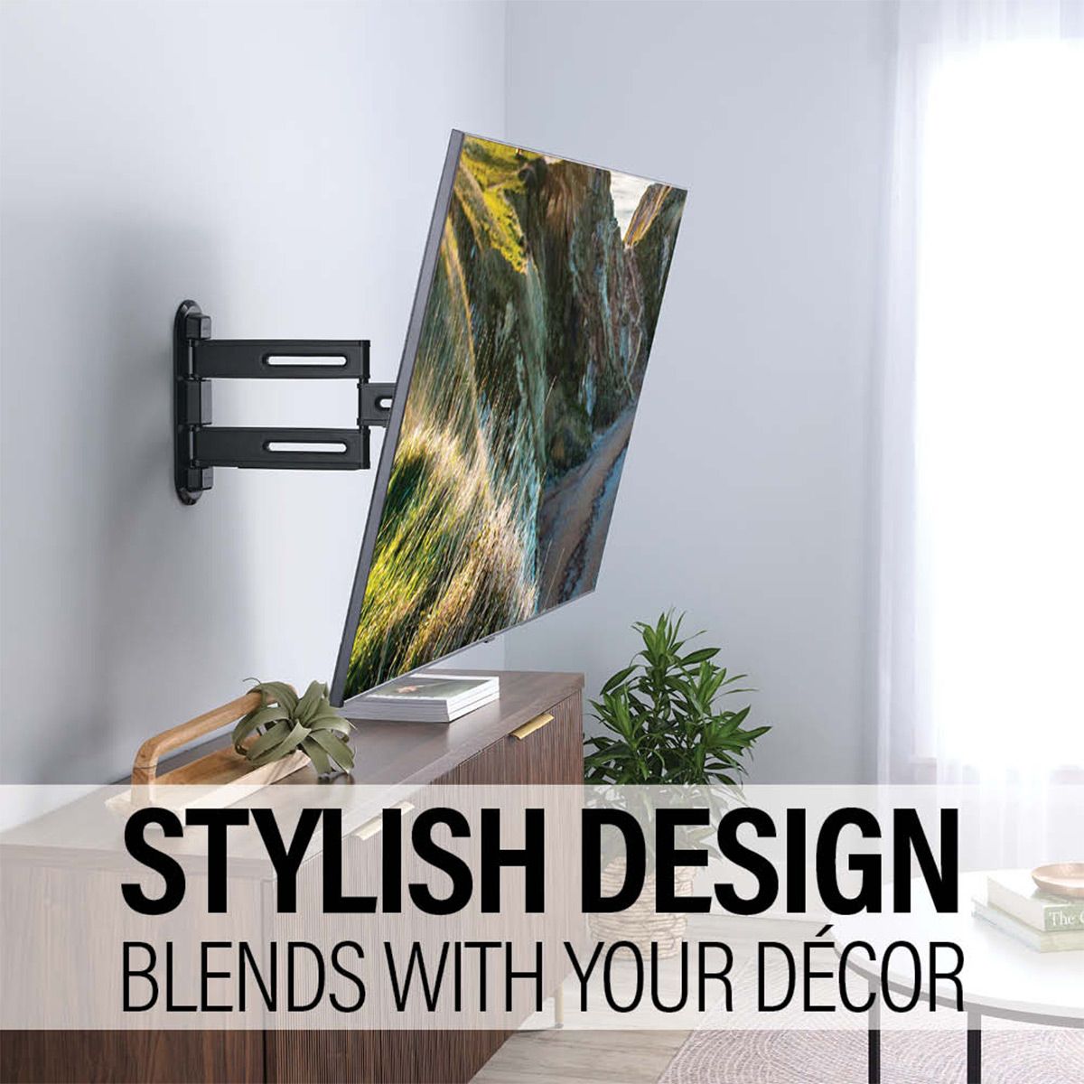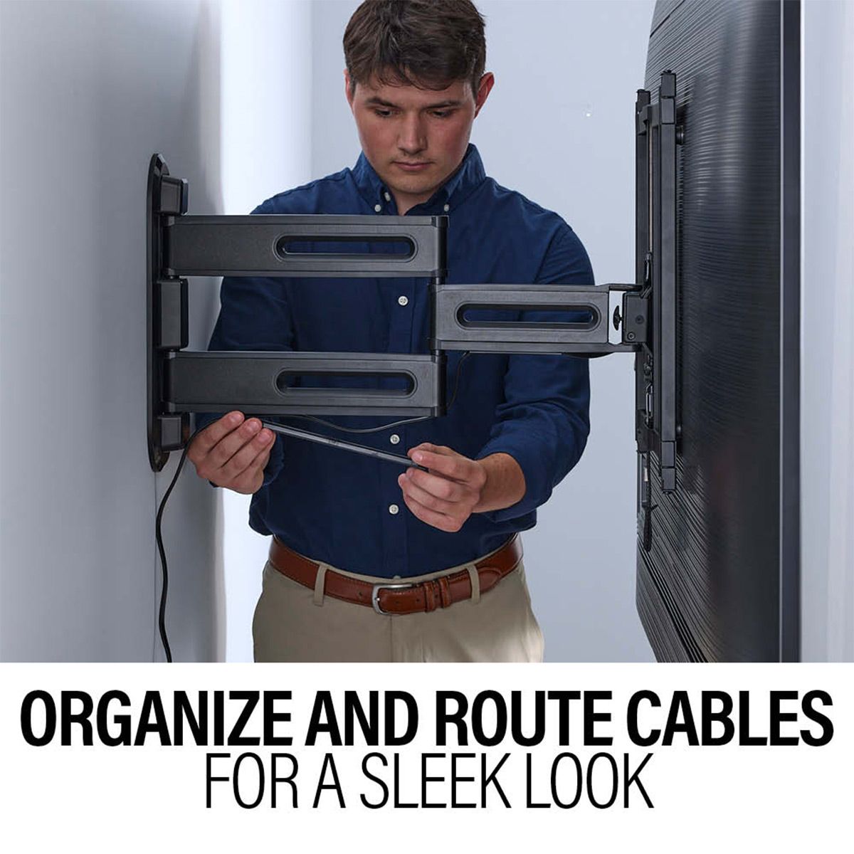 Sleek DesignDesigned to blend seamlessly with TVs and dcor the Advanced Full-Motion 4D + SHIFT TV Mount was inspired by the sleek look of modern TVs and ultra-high-end kitchen appliances. Beneath the mounts stylish exterior is an ultra-strong solid steel frame that provides maximum support ensuring your TV will stay securely in place. With a lower profile depth than traditional full-motion mounts this mount positions TVs closer to the wall creating a more streamlined look. Route your cables along the arms of the TV mount and ensure a clean and organized look for your home entertainment system.