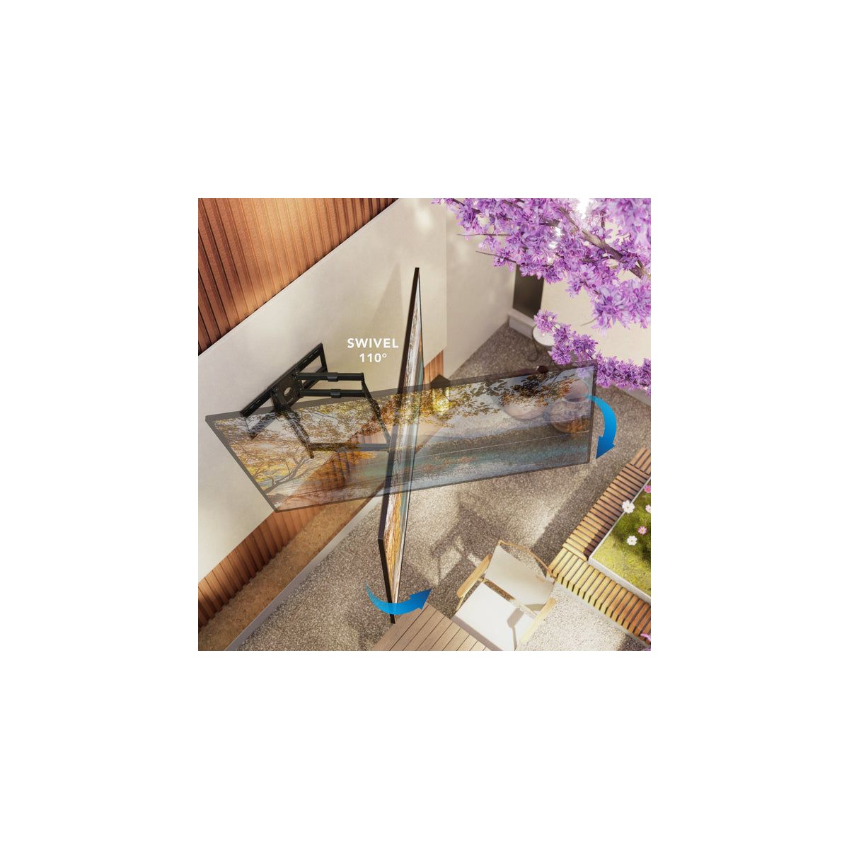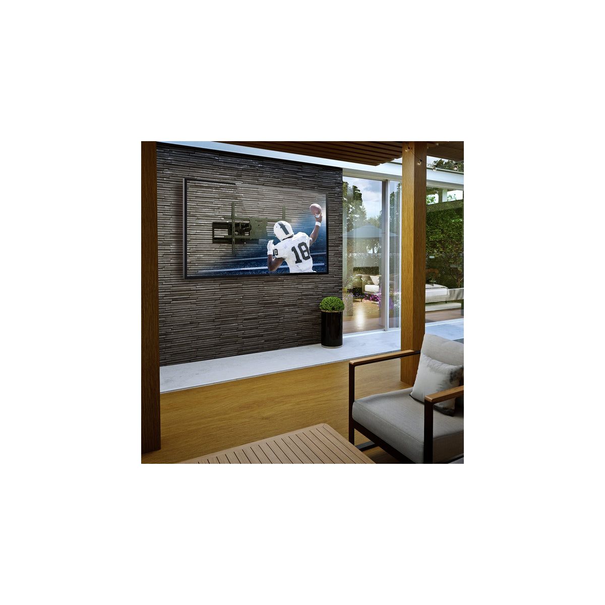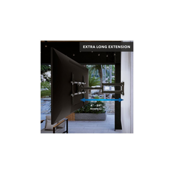 Introducing The Beast Weatherproof Heavy Duty TV Wall Mount, designed to bring robust, reliable performance to your outdoor entertainment spaces. This mount is expertly crafted with resilient weather-resistant materials, including stainless steel hardware and a durable outdoor powder coating, making it the ultimate choice for patios, decks, or commercial outdoor areas where durability is essential. Built to support large displays from 60" to 110" and up to 275 lbs, The Beast ensures exceptional stability, safely anchoring your screen for years of outdoor enjoyment. With an incredible 38.6" extension from the wall, plus comprehensive tilt and swivel capabilities, you can enjoy optimal viewing angles regardless of your setup. The innovative horizontal slide technology within the full-size backplate allows precise screen positioning, simplifying installation on both 16" and 24" stud configurations. Its extensive VESA compatibility makes this versatile mount compatible with a wide range of TVs and the built-in safety brackets ensure secure mounting.