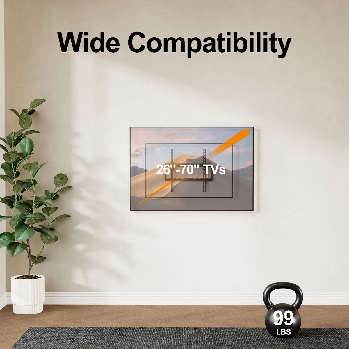 Upgrade your viewing experience with this premium Tilted TV Mount, designed to fit most 26"-70" flat and curved TVs. This heavy-duty mount supports up to 99 lbs, providing a secure and stable platform for your larger television. Perfect for any room in your home, this mount offers effortless tilting to reduce glare and ensure the best viewing angles from any position. Featuring a simple yet effective tilt function, this mount allows you to easily adjust your TV up to 15° for improved comfort and reduced eye strain. Whether you're watching from the couch, standing, or lying down, you can customize the angle to suit your needs. The low-profile design keeps your TV close to the wall, providing a clean, modern look while saving space. With universal VESA compatibility (up to 400x400mm), this mount works with a wide variety of TV brands, making it the ideal choice for any setup. The easy installation process includes all necessary hardware and step-by-step instructions, so you can mount your TV with confidence.