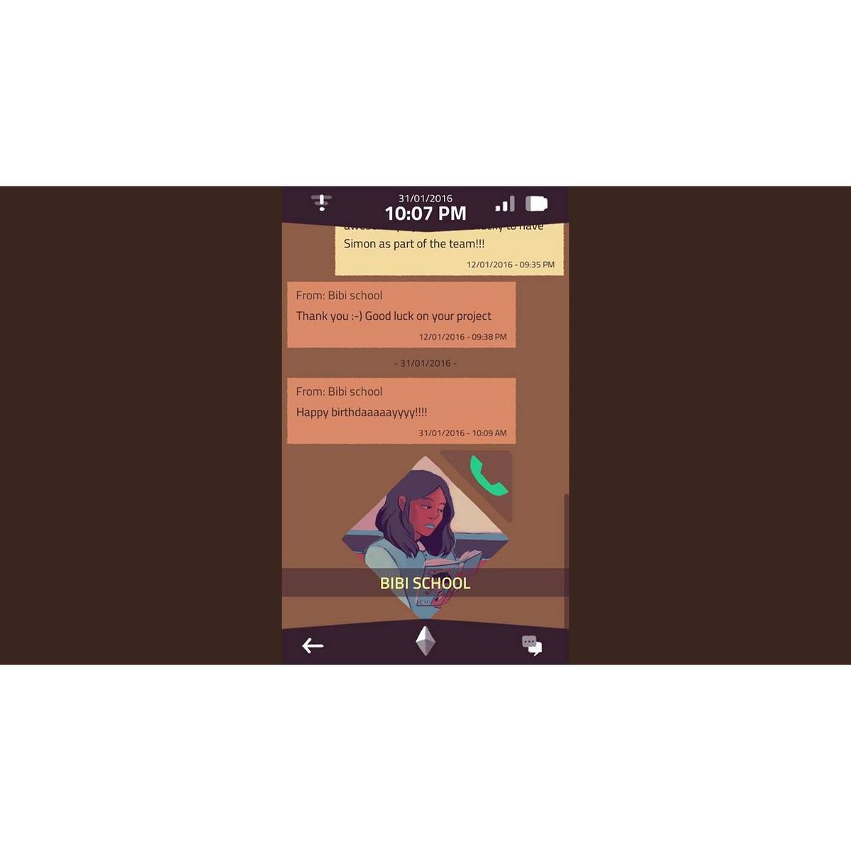 The game takes the shape of a narrative investigation: you have to search the phone’s text messages, pictures and applications, in order to learn about its former owner. Through this phone, you uncover Sam’s life, friends, family and relationships, until the evening when they turn 18 and mysteriously disappear.