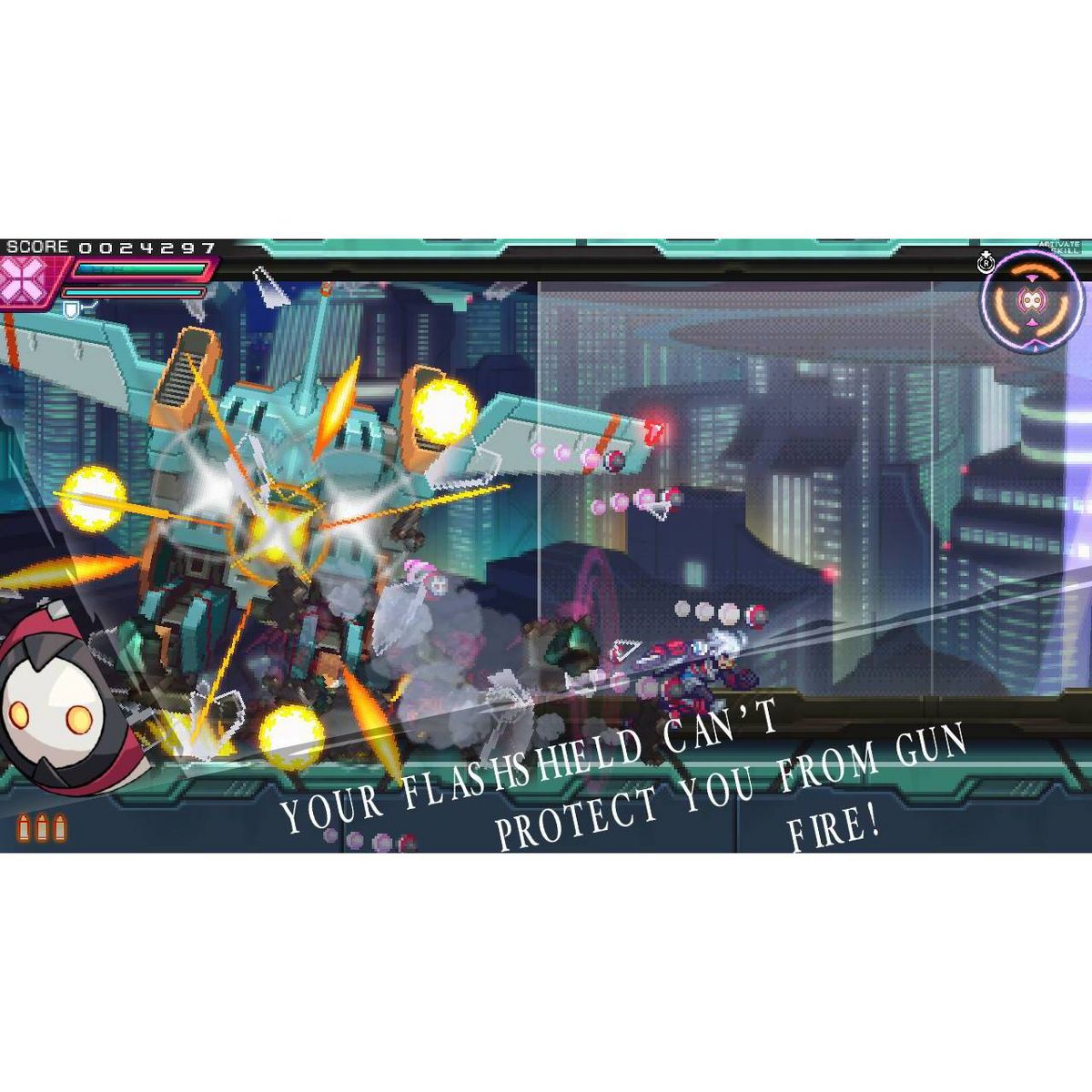 Azure Striker Gunvolt's deep storyline plays out both during breaks in the action and in the thick of battle too! Featuring a robust cast of characters that are fully voiced (in Japanese) and over 25 vocal tracks performed by characters in the game, the world of Gunvolt provides excitement at every turn.