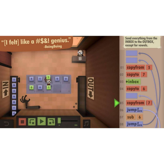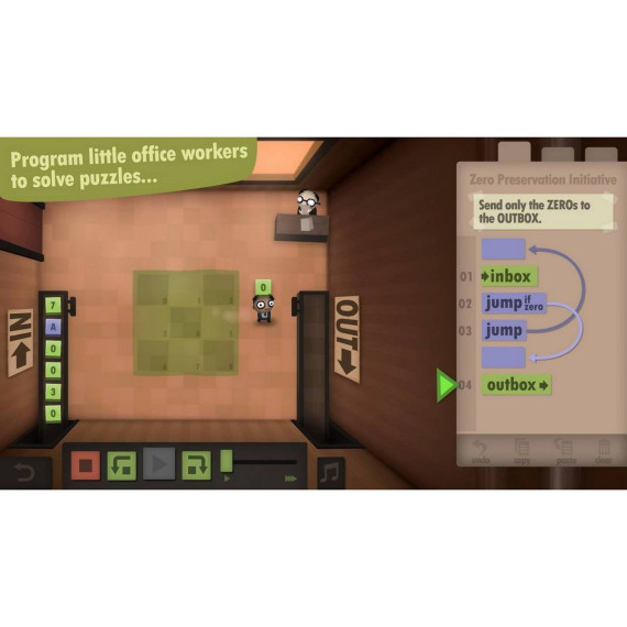 Human Resource Machine is a puzzle game for nerds. In each level, your boss gives you a job. Automate it by programming your little office worker. If you succeed, you'll be promoted up to the next level for another year of work in the vast office building. Congratulations! Don't worry if you've never programmed before — programming is just puzzle solving. If you strip away all the 1s and 0s and scary squiggly brackets, programming is actually really simple, logical, beautiful, and something that anyone can understand and have fun with! Are you already an expert? There will be extra challenges for you. From the creators of World of Goo and Little Inferno. Have fun! Management is watching.