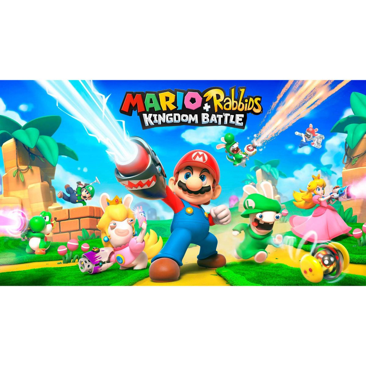 The Mushroom Kingdom has been torn apart by a mysterious vortex, transporting the chaotic Rabbids into this once-peaceful land. To restore order, Mario, Luigi, Princess Peach, and Yoshi must team up with a whole new crew: four Rabbids heroes! Together, they will battle with weapons through four worlds filled with combat, puzzles, and unpredictable enemies.